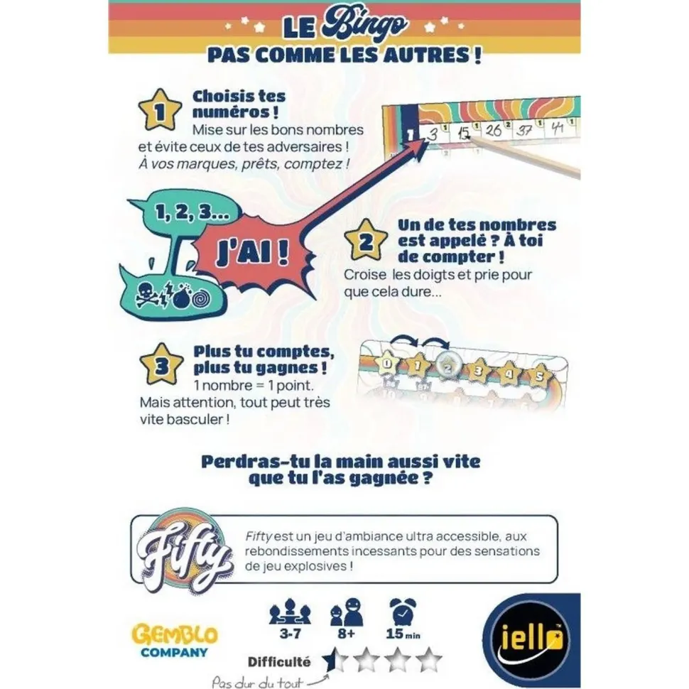 Dans Fifty, revisitez le bingo avec une touche stratégique ! Choisissez vos numéros et lancez le décompte de 1 à 50. Plus votre série est longue, plus vous marquez de points. Mais attention, dès que vous annoncez le nombre d’un adversaire, c’est lui qui reprend la main… et le comptage ! Il faudra donc bien réfléchir à vos choix pour piéger vos adversaires et créer les plus longues suites possibles. Un jeu dynamique et malin qui promet des parties rythmées et pleines de suspense.