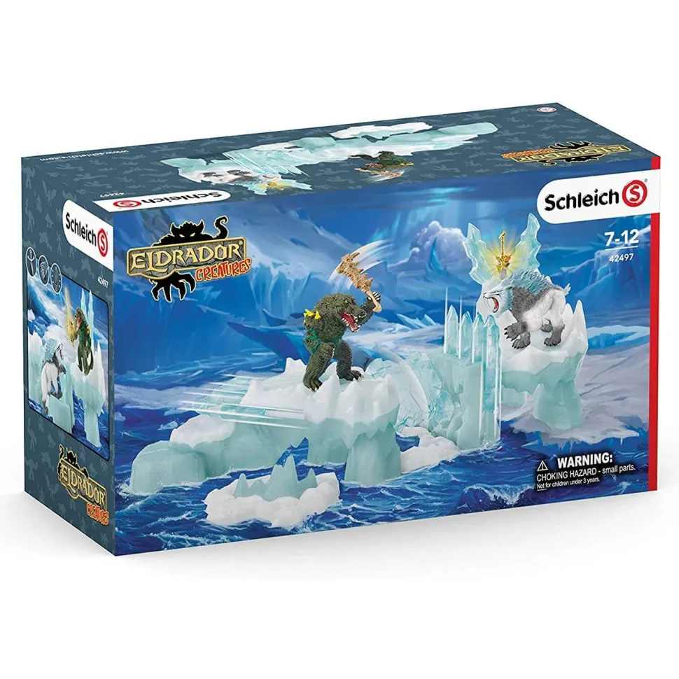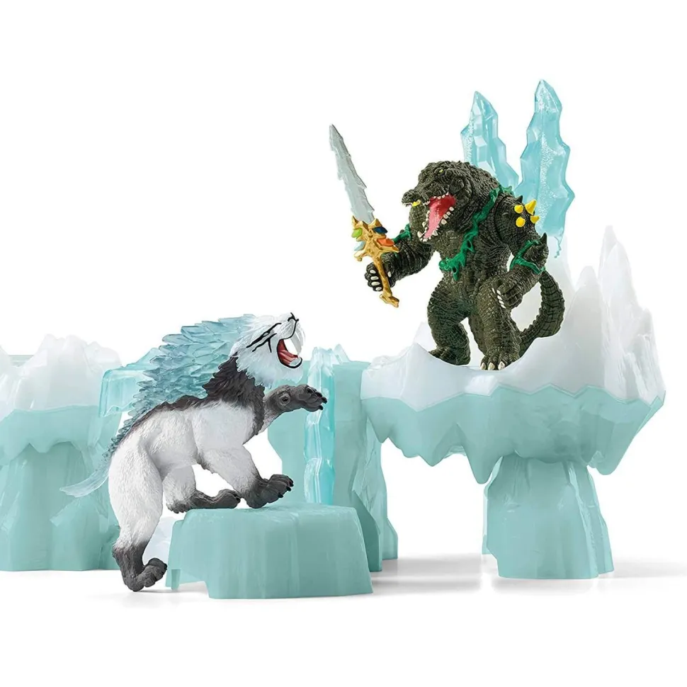 Découvrez les figurines Attaque de la forteresse de glace de la collection Eldrador. des obstacles sournois, un solide pont-levis et une cachette secrète attendent le crocodile de combat du monde de la jungle dans les profondeurs des glaces.