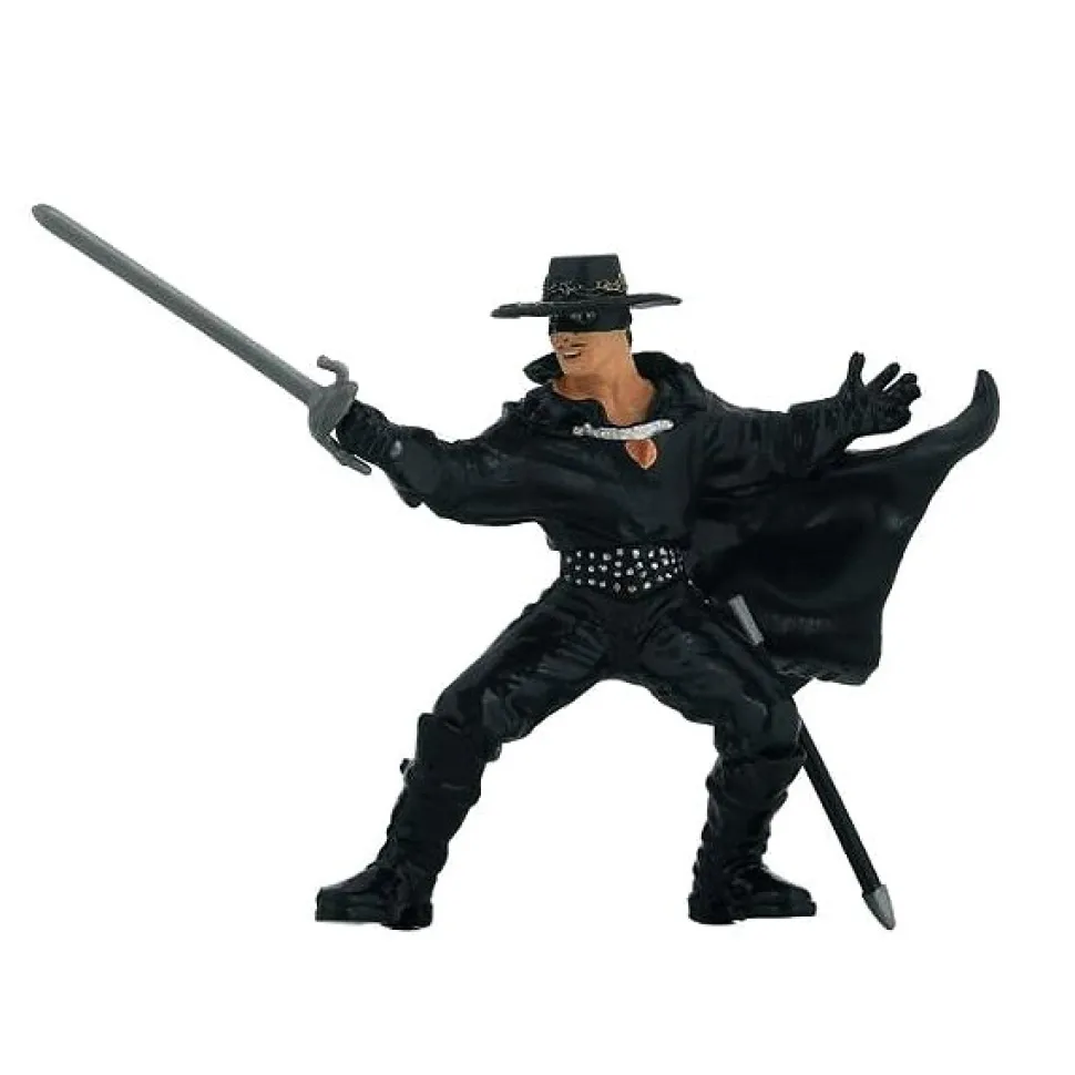 Zorro, le célèbre cavalier masqué, de Papo.Il se tient debout mais peut également monter à cheval (référence Papo-30253).Figurine peinte à la main.Dimensions : 13 (L) x 8,9 (H) cm.