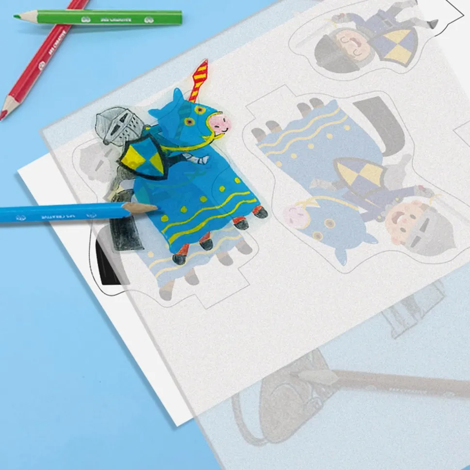 Découvre la magie du film rétractable ! Ce kit comprend tout le nécessaire pour confectionner ton propre château et même des chevaliers. Trace les exemples, colorie-les et place-les dans un four chaud. Waouh ! Regarde comme tes créations rétrécissent vite. Elles sont prêtes ? Alors mets toutes tes créations dans les supports en mousse inclus, mais où est le château ? Tu peux facilement le découper dans l’emballage.