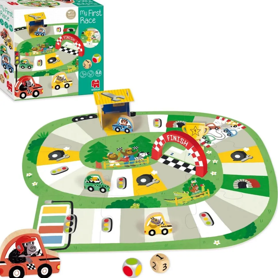 Un premier jeu de course de voitures. Chacun leur tour, les joueurs lancent le dé et avancent leur voiture du nombre de case correspondant à la valeur du dé. Le joueur qui fait arriver sa voiture en premier sur la ligne d’arrivée gagne la partie. Mais attention aux cases spéciales qui pourront vous faire avancer ou reculer. Un premier jeu de société pour apprendre à attendre son tour, à faire rouler le dé et à faire l’action correspondante. Un joli jeu de parcours avec des voitures en bois conduites par des animaux rigolos.