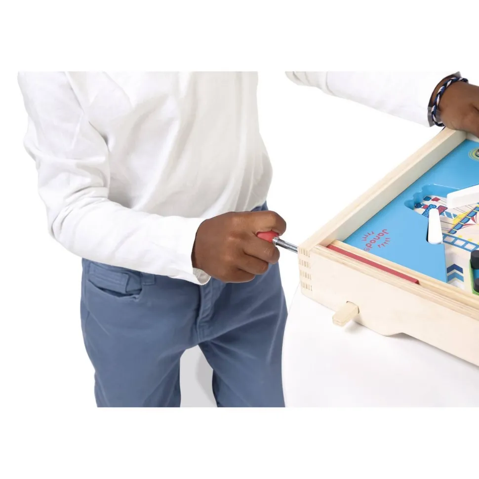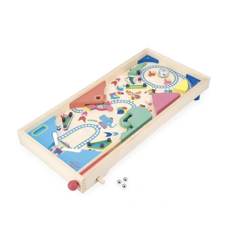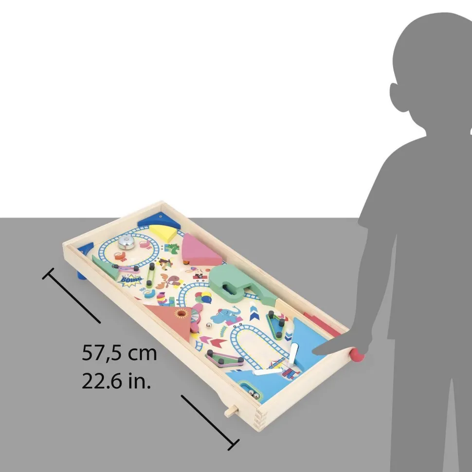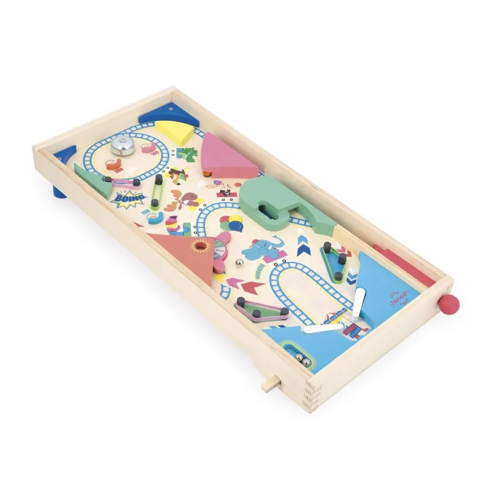 Un flipper de table est aussi un chouette moyen d’apprendre à additionner les points, pour tenter de battre son record personnel ! Sur le thème de la fête foraine, ce flipper jouet est livré avec 3 billes en métal. Sur le plateau en bois naturel, un grand-huit en folie donne le ton de la partie : un jeu festif, plein de rebondissements et de suspense, où l’on passe rapidement d’une émotion à l’autre ! 4 élastiques jouent le rôle de slingshots pour renvoyer la bille avec force, 1 roue permet de remporter toujours plus de points, et 1 cloche tout en haut peut être ciblée avec objectif de faire retentir le signal de la victoire ! Il y a aussi de nombreuses zones bonus pour accumuler des points supplémentaires, soit tout pour une partie de flipper endiablée !