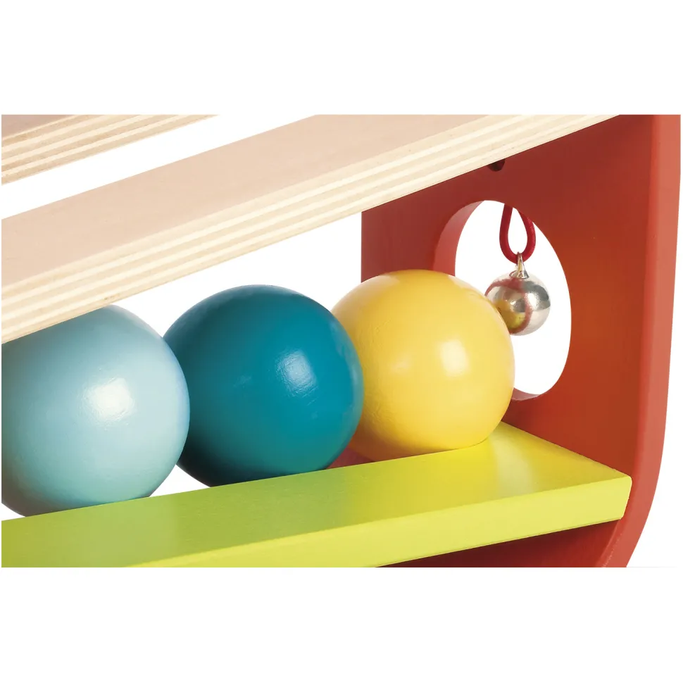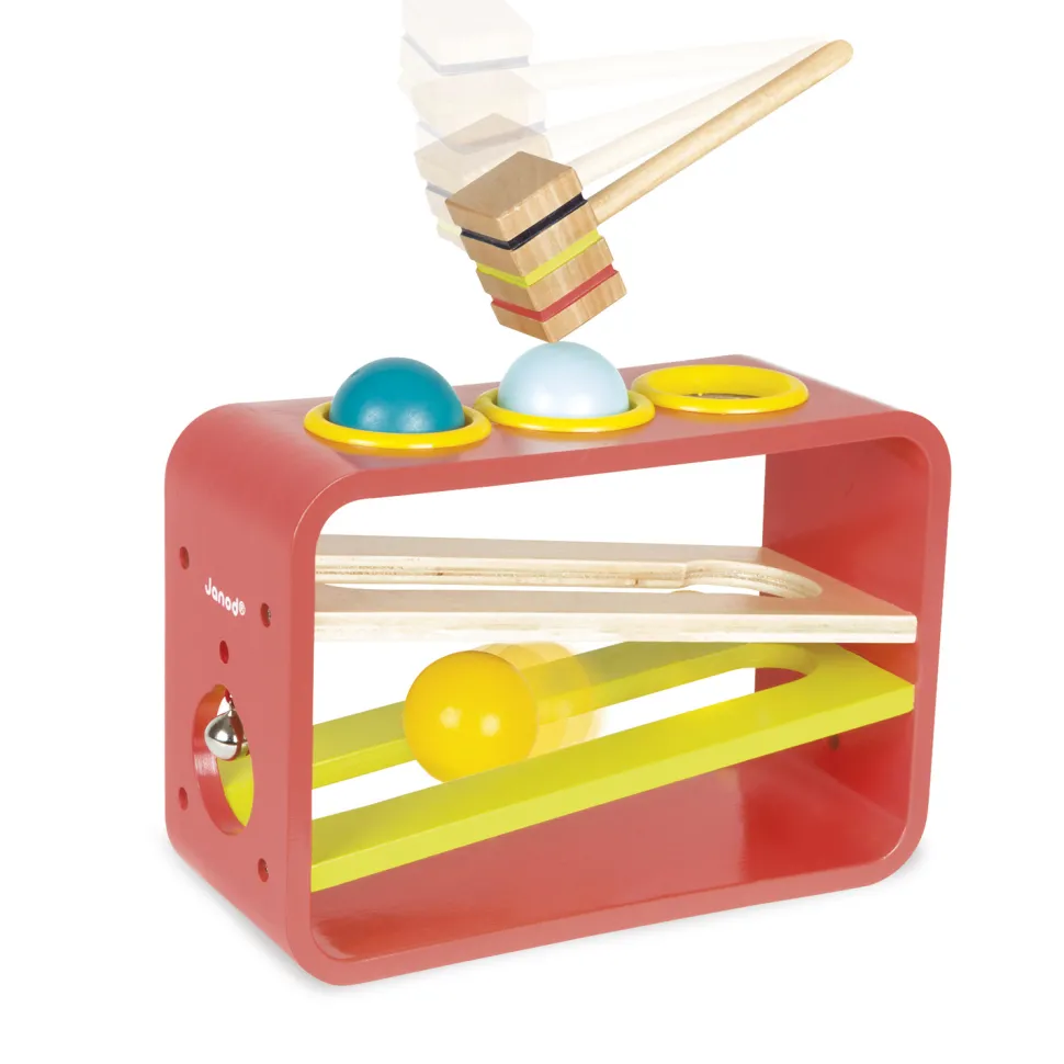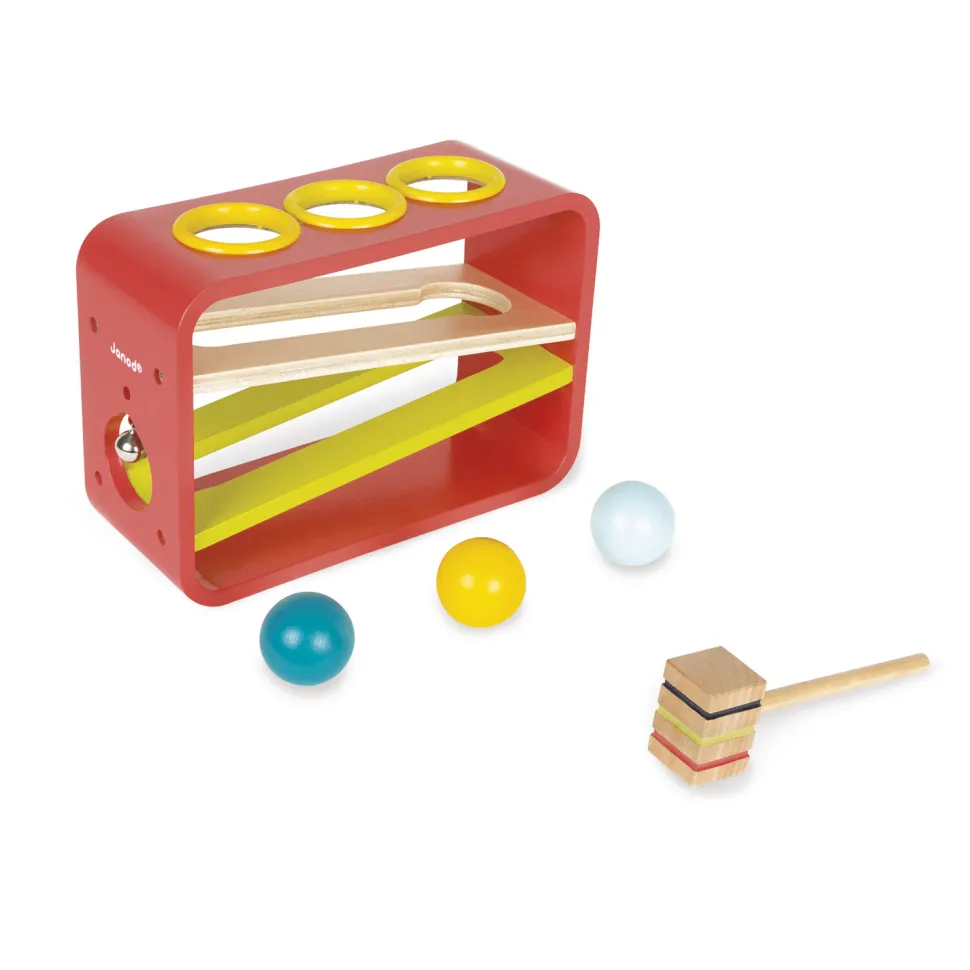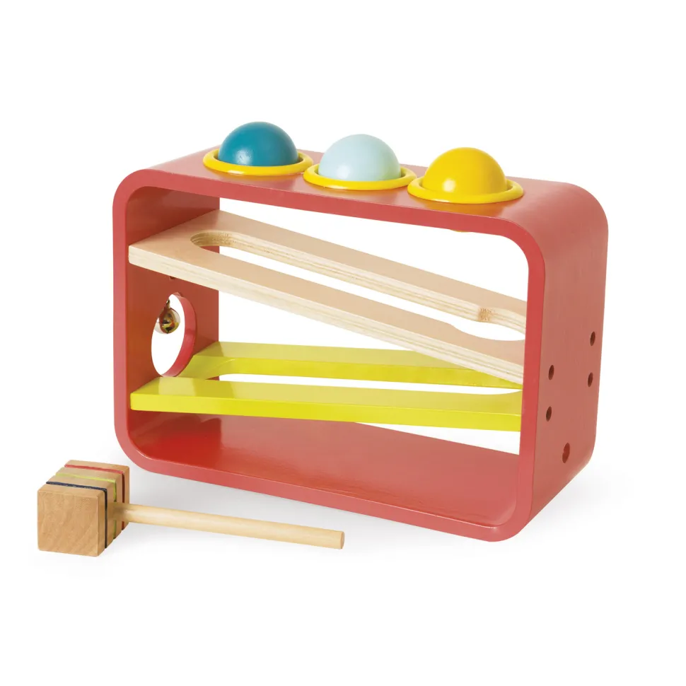 Jouet d’éveil idéal pour développer la dextérité de bébé.Trois boules de couleur et un marteau en bois, pour s’amuser pendant des heures voilà un jouet de choix !Approchez la balle du trou avec le marteau puis regardez la tomber et rouler. La prochaine dans la file arrive aussitôt. A la sortie, les balles font retentir la clochette en bois.Dimensions : 27.5 x 10 x 20.5 cm.