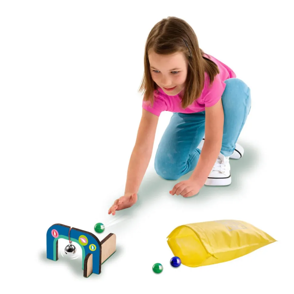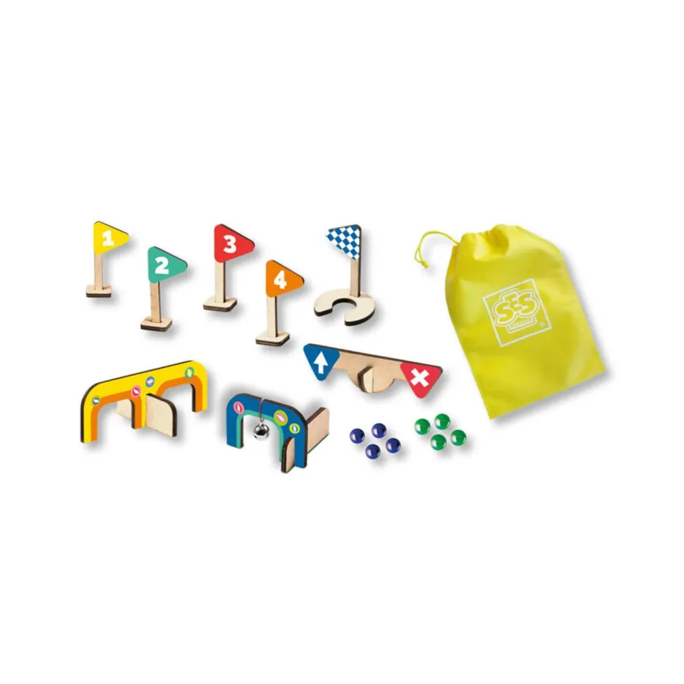 Le kit inclut des obstacles en bois et huit billes. Installe les obstacles où tu le souhaites et commence à jouer ! Qui l’emportera ? Les obstacles en bois s’accompagnent d’autres accessoires amusants, comme une cloche et une porte rotative. Le jeu est terminé ? Emporte facilement le jeu partout avec toi grâce au sac de rangement pratique !
