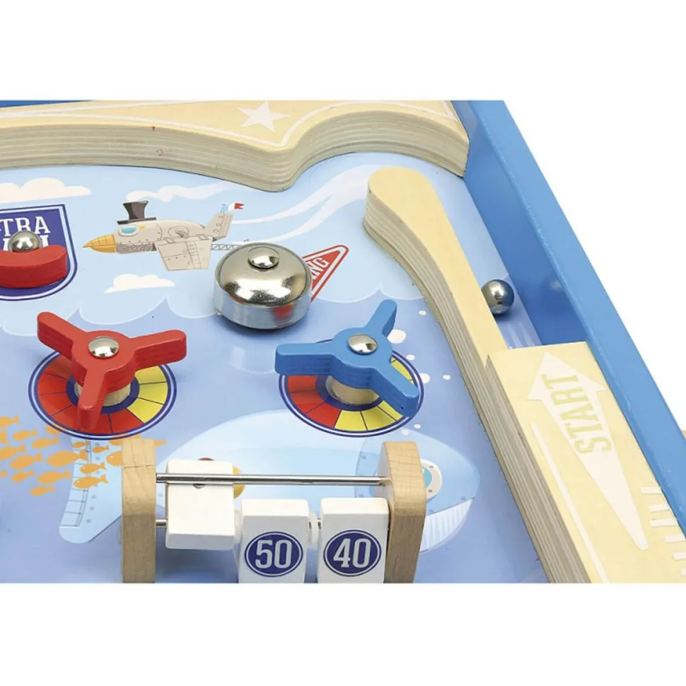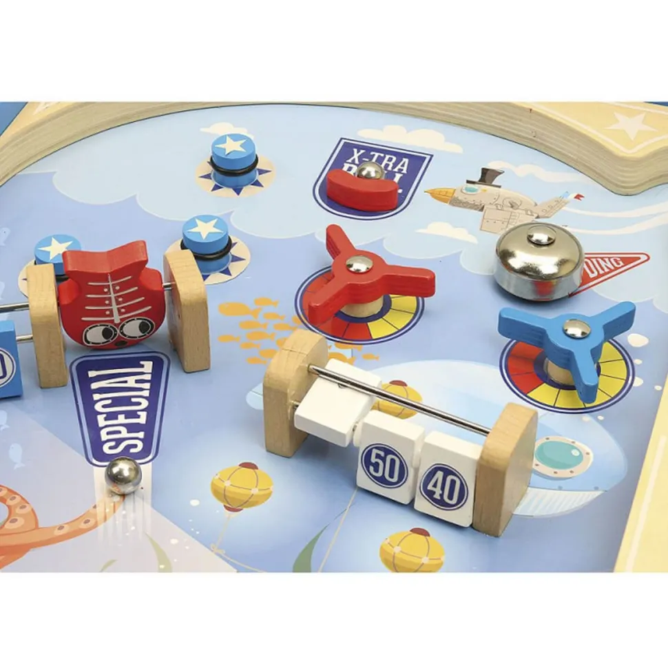 Superbe flipper sur le thème sous-marin pour apprendre à jouer comme les grands à partir de 5 ans !Ce flipper tout en bois à poser est livré avec 3 billes en métal pour dégommer les cibles, actionner les clochettes, emporter les tourniquets… Marquez le plus de points en maîtrisant la trajectoire des billes et remportez la bataille sous la mer.Les pieds en bois du flipper sont amovibles.Dimensions de la boîte : 36 x 60 x 13,5 cm.