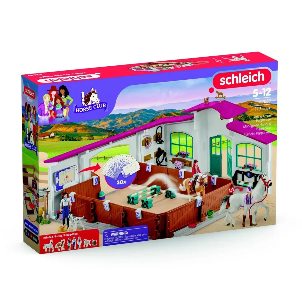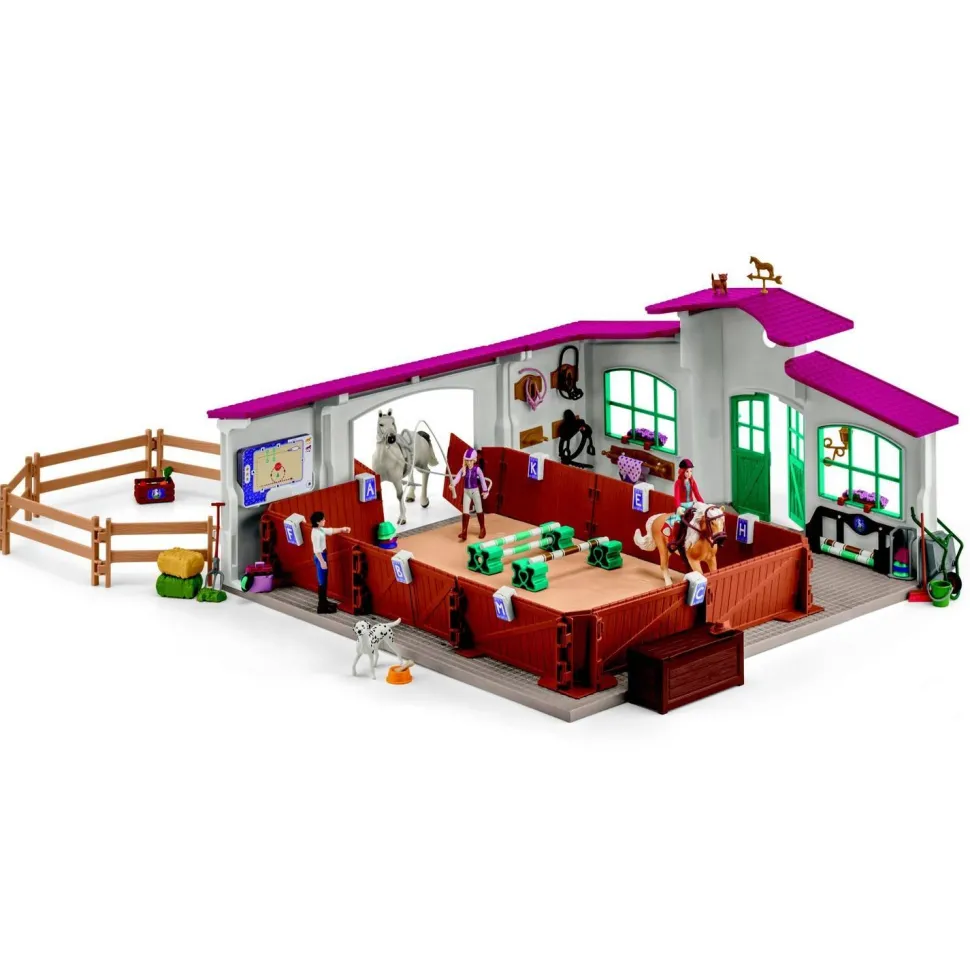 Ce centre équestre réaliste est idéal pour des cours de voltige et de saut d’obstacles. L’arène spacieuse, les cartes mémos illustrant différentes figures de dressage, ainsi que l’équipement complet permettent des heures de jeu dynamiques et pédagogiques. Avec ses figurines et ses nombreux accessoires, il recrée l’ambiance authentique d’une école d’équitation.