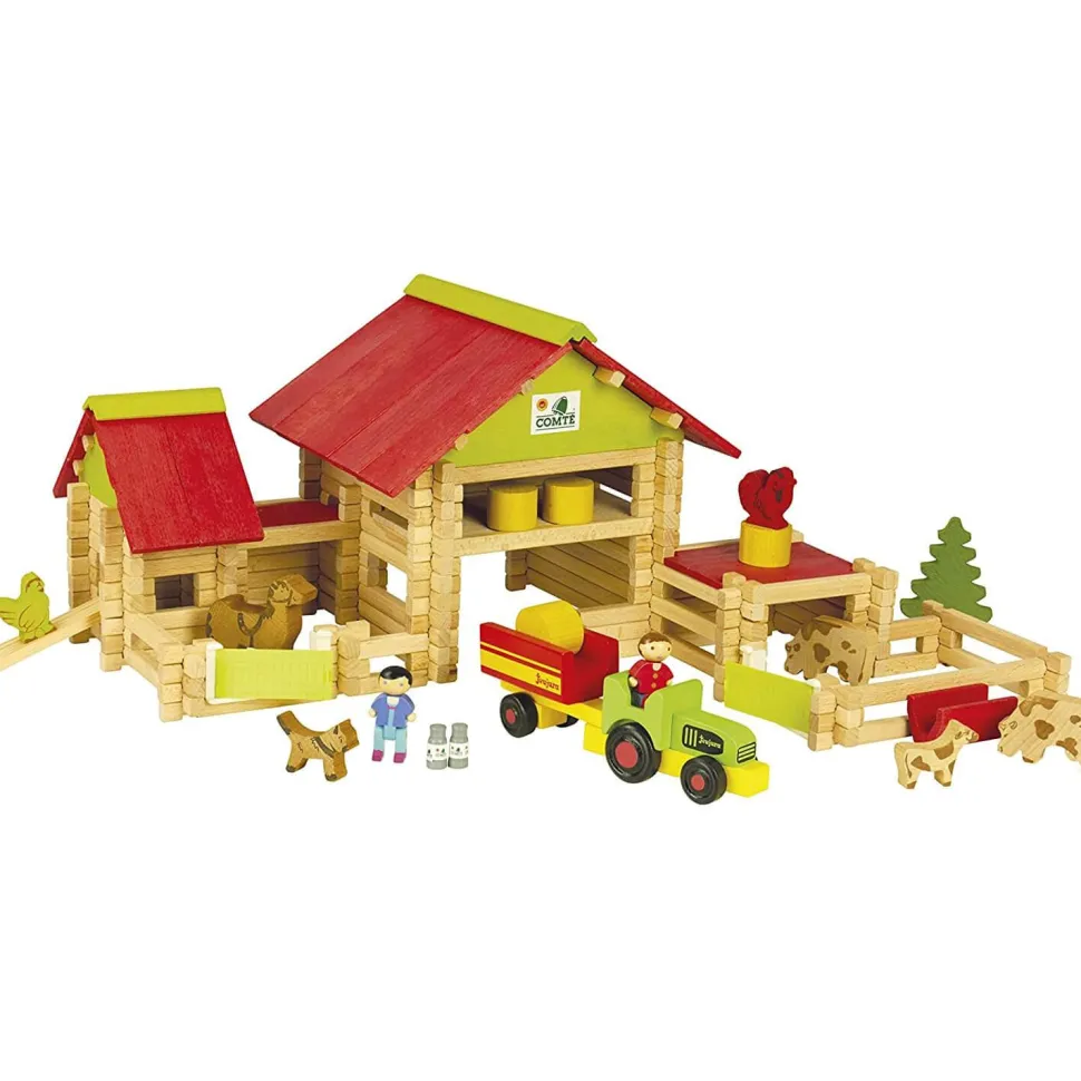 Description du produit : Grande ferme avec tracteur et animaux en bois : 220 pièces