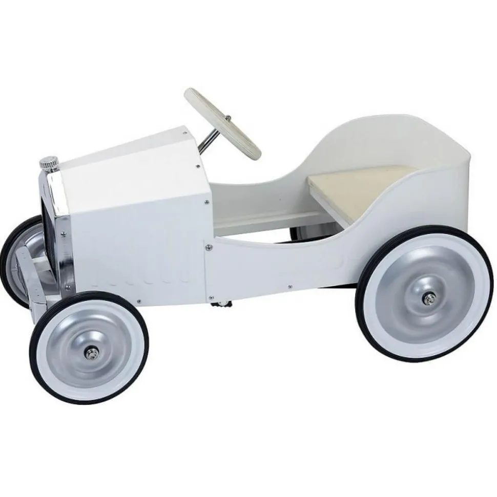 Cette grande voiture à pédales en métal aux finitions laqués couleur ivoire et éléments en bois naturel (Volant et assis) est un porteur au look vintage et rétro. Il renforcera les fonctions motrices de votre enfant et l’aidera dans sa capacité à se déplacer. Cette charmante voiture sera également un superbe élément de décoration pour la chambre de votre enfant.