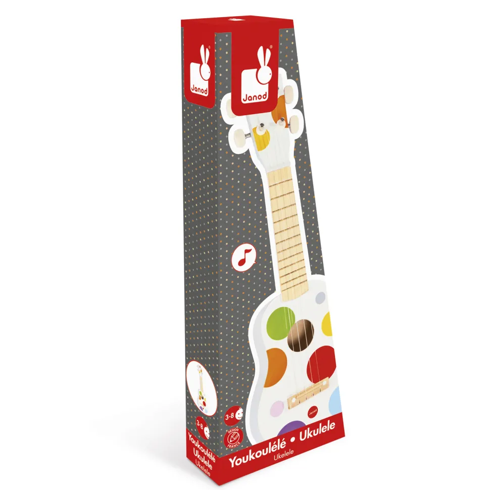 La célèbre marque Janod, spécialiste des jouets en bois, propose à un enfant ce joli ukulélé en bois décoré de confetti. L’instrument est blanc avec de jolis ronds colorés qui sauront attirés le regard de l’enfant. Avec un tel jouet entre les mains, comment résister ?Inclus dans la boîte :-1 ukuléléDimensions : 53,5 x 17,5 x 5 cmNombre de cordes : 4Couleurs : blanc, bleu, rouge, jaune, vert, orange, roseCe ukulélé à 4 cordes est idéal pour initier un enfant au plaisir de la musique. Avec cet instrument entre les mains, il pourra laisser libre cours à toute son imagination et créera ainsi des mélodies diverses et variées ! Peut-être se découvrira-t-il une passion pour la musique ?L’instrument est en bois de qualité et résistera aux manipulations de l’enfant. Il est également léger et adapté à l’enfant. Il pourra en jouer en toute simplicité. Vous pourrez agrandir la collection du petit musicien en herbe avec : l’harmonica confetti JANODOffrez ce cadeau original et sympathique à un enfant, il sera enchanté !