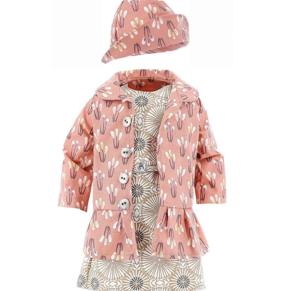 La tenue se compose d’une robe, d’une veste longue et d’un chapeau rose. Le chapeau est la veste ont le même imprimé dans les tons roses, la robe est dans les tons beige. Il y a un volant sur le bas de la veste.