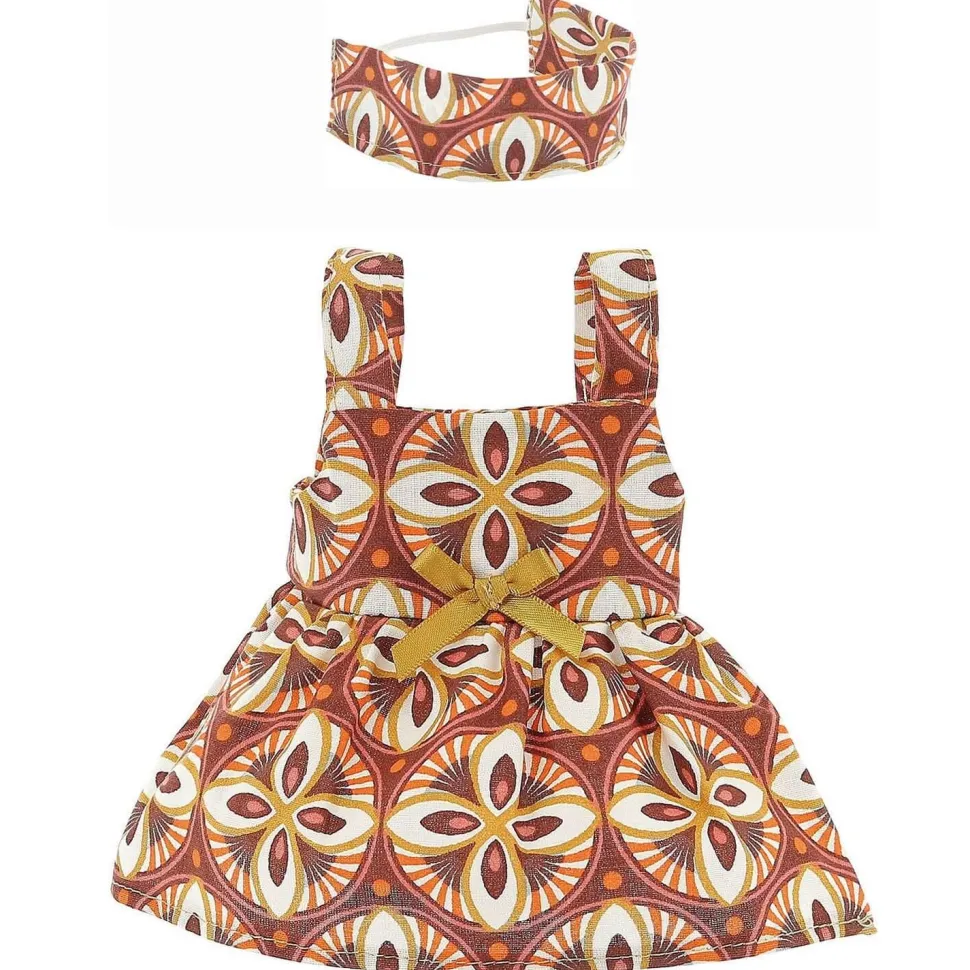 La tenue se compose d’une robe à bretelles rouge foncé et moutarde à motifs et d’un bandeau pour cheveux coordonné. Le bandeau tient sur la tête de la poupée grâce à un élastique. La robe est froncée à la taille et ornée d’un nœud satiné couleur moutarde. Cette superbe tenue ajoutera une touche colorée à votre adorable poupée.