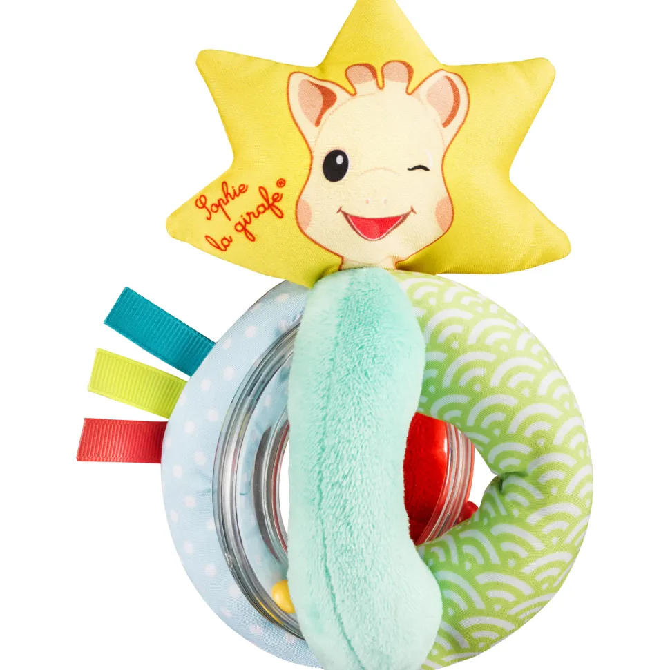 Ce hochet comporte plusieurs anneaux surmontés d’une étoile avec la tête de Sophie la Girafe. Les différents anneaux vont permettre à l’enfant de prendre et de manipuler facilement le hochet. Quand il va le secouer, il verra et entendra les billes s’entrechoquer, ce qui va stimuler son ouïe.