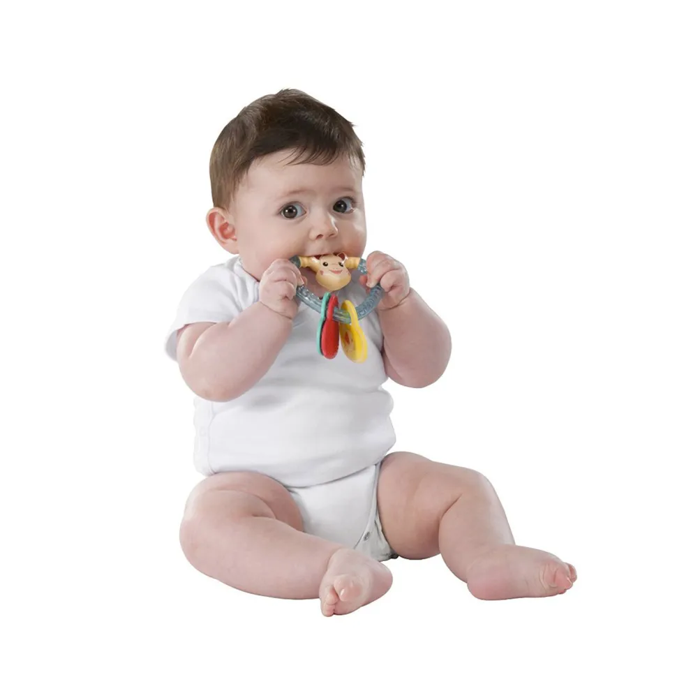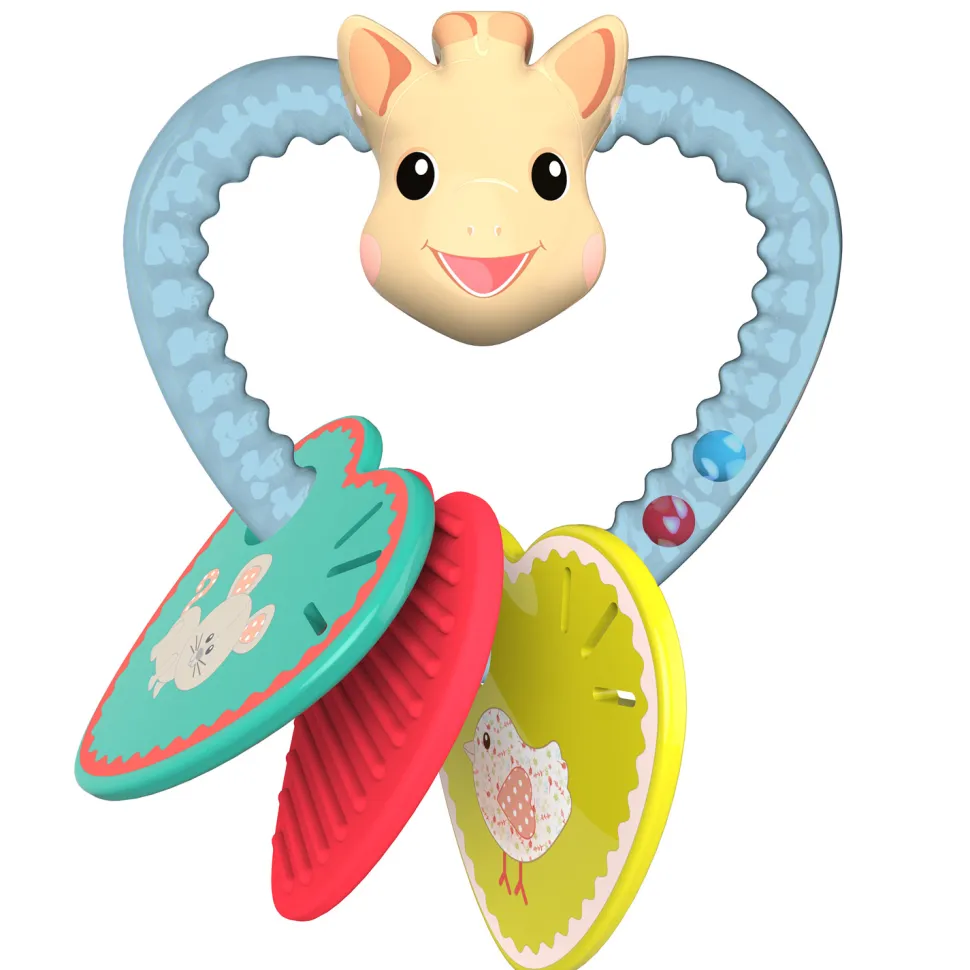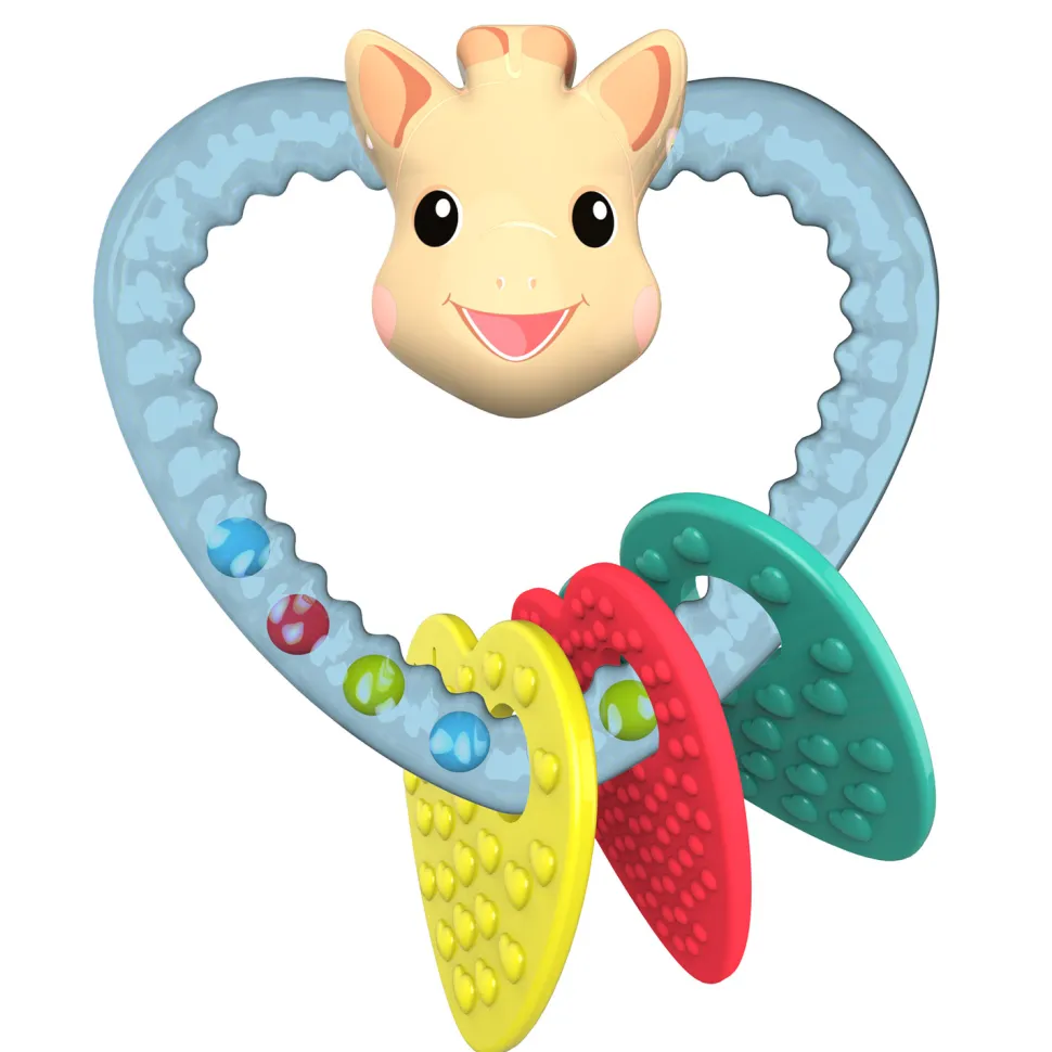 Un hochet en coeur pour s’amuser avec tendresse avec Sophie la girafe, le compagnon préféré des tout-petits.Ce hochet se présente sous la forme d’un coeur en plastique avec la tête de Sophie la Girafe et comprend trois médaillons de coeur, rouge, jaune et bleu, illustrés avec ses amis Joséphine la souris, Margot la tortue et Kiwi l’oiseau. Facile à saisir et à manipuler, ce hochet est parfaitement adapté aux petites mains de bébé, il pourra donc l’agiter et faire s’entrechoquer les petites billes colorées contenues à l’intérieur à sa guise.De plus, l’un des médaillons est en matière souple, ainsi votre bébé pourra le mordiller en toute sécurité pour soulager ses gencives douloureuses.