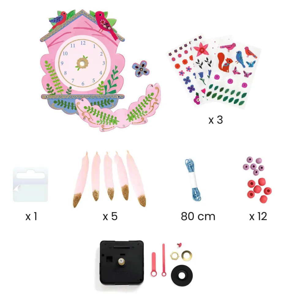 Contenu : 1 horloge en 3 pièces à assembler, 3 planches de décalcomanies, 1 mécanisme silencieux pour horloge (fonctionne avec 1 pile AA-LR06 1,5 V non fournie), 2 jeux d’aiguilles, du fil (L. 80 cm), 12 perles colorées en bois, 5 plumes pailletées, 1 crochet, 1 feuillet de pas-à-pas détaillé.