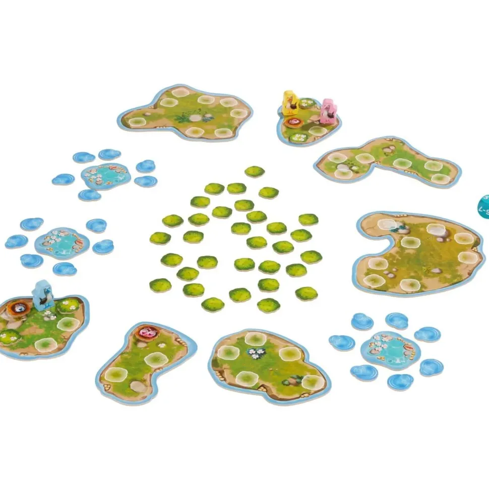 Contenu : 12 lieux, 60 cartes, 5 fous, 5 compteurs de points de fous, 35 plaquettes de nid, 1 dé, 36 plaquettes de buisson, 27 plaquettes d’eau, 1 tableau de score, 5 coquillages, 1 règle du jeu.