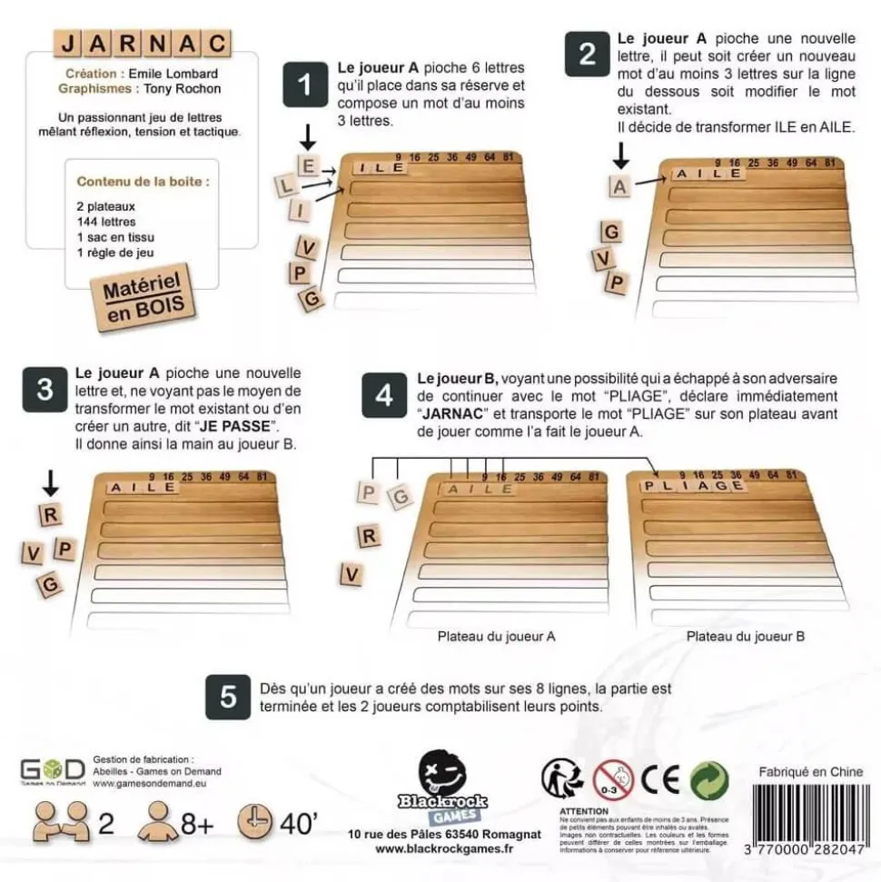 JARNAC est un duel de mots où chaque joueur devra constituer des mots de plus en plus longs afin de marquer un maximum de points, tout en évitant de s’en faire voler par son adversaire.