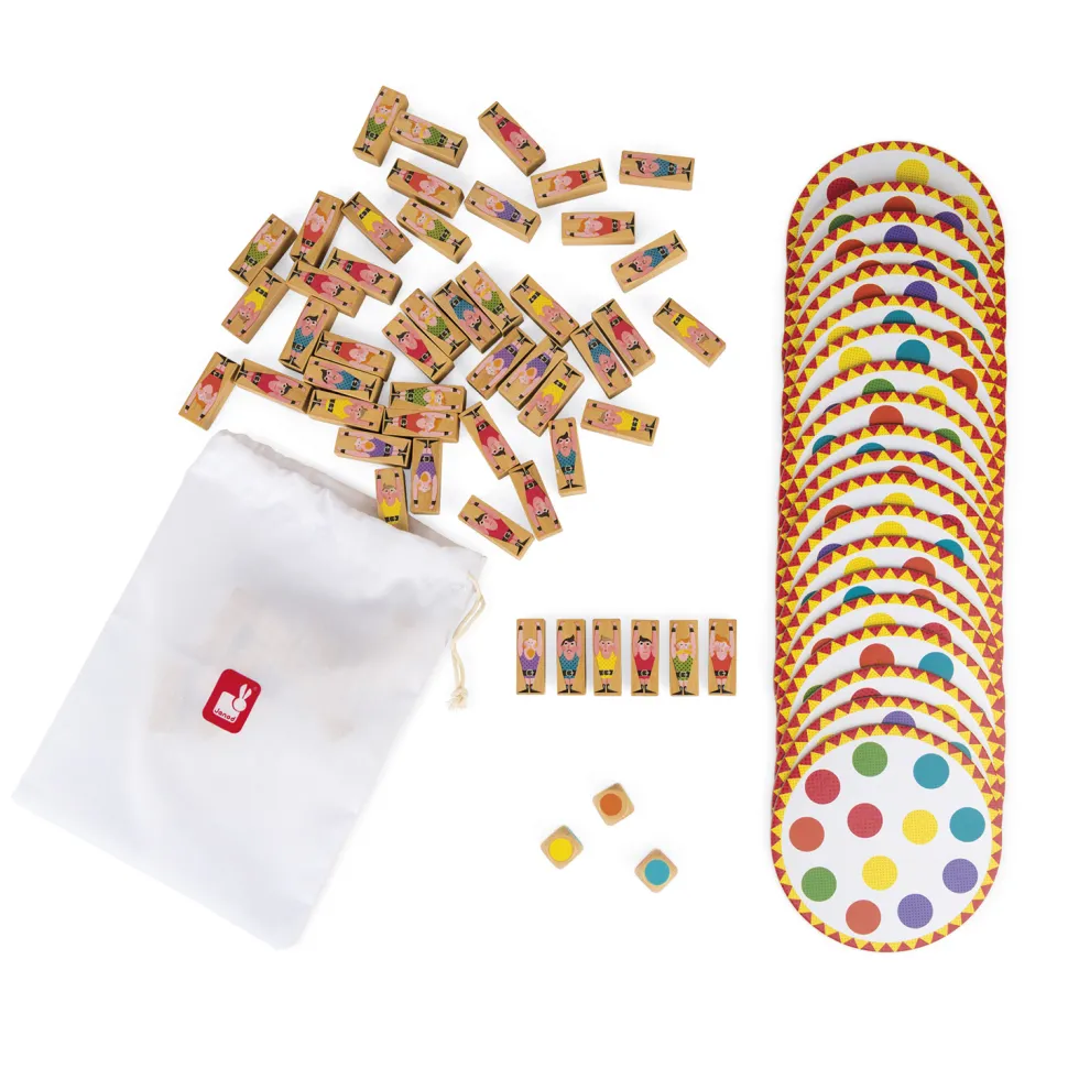 Un jeu d’adresse, de concentration et de tactique pour les enfants de 5 à 10 ans ! Lancez les dés pour savoir sur quelles pastilles de couleurs vous allez devoir poser vos acrobates. Attention, placez-les de façon stratégique afin de créer la tour la plus haute possible. Si elle s’effondre, vous avez perdu ! Nombre de joueurs : 2 à 8.Durée moyenne d’une partie : 15 minutes.Matériel de jeu : – 57 pions acrobates en bois- 20 disques- 3 dés aux faces colorées- 1 sac de rangementDimensions des acrobates : L1.3 x l1.3 x H3.5 cm.Diamètre des disques : Ø10.5 cm.
