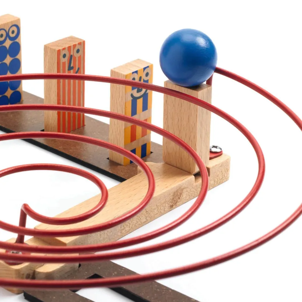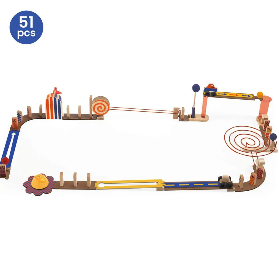 Contenu : 1 jeu de construction en bois de 51 pièces dont 3 grosses billes en bois. 1 livret explicatif de 24 pages inclus.