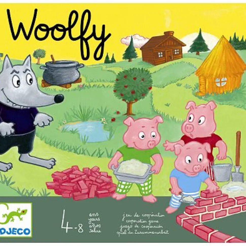Jeu de coopération – Woolfy Contenu du jeu : – 1 plateau- 3 pions cochons- 1 pion loup- 1 marmite- 1 maison à assembler- 3 désCe jeu de société reprend le célèbre conte des 3 petits cochons. Les joueurs doivent chercher à construire la maison de brique afin d’y mettre en sécurité les trois petits cochons, avant que le loup ne les ait attrapés et mis dans la marmite.Placez les 3 petits cochons et le loup sur le départ et jetez chacun votre tour le dé de la couleur de votre choix. Lorsque le dé tombe sur une des faces 1, 2 ou 3 le cochon avance du nombre de points. Si le dé tombe sur la face « maison « , le cochon peut se mettre à l’abri du loup dans la maison de son choix. Enfin, lorsque le dé montre le loup, le joueur doit déplacer le loup jusqu’à la prochaine case loup. Si un cochon se trouve sur le passage du loup, celui si se retrouvera dans la marmite ! Nombre de joueurs : 2-4 Durée de la partie : 20 mn Dimensions : 30 x 28 x 5 cm.