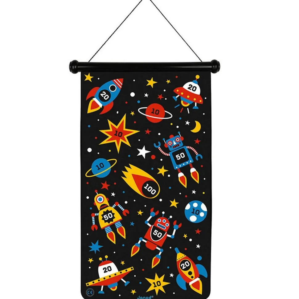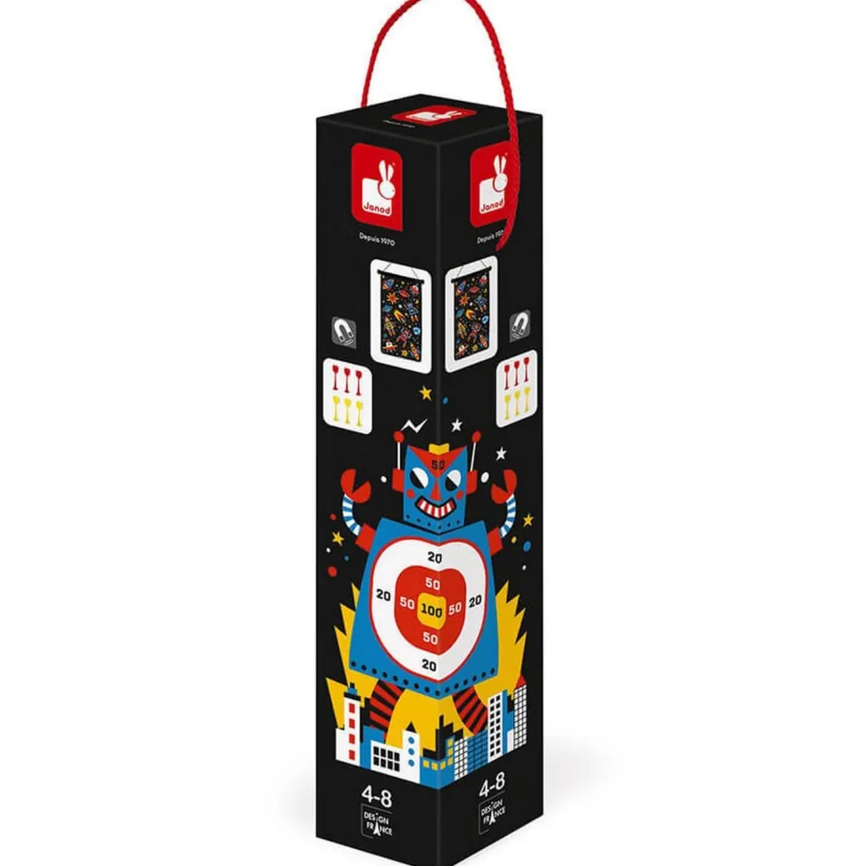 Grâce à une cible et à des fléchettes aimantées, les enfants à partir de 4 ans vont pouvoir eux aussi goûter aux joies de la compétition. Avec cette version, plongez dans l’univers des robots et tentez d’atteindre les 100 points en jouant d’adresse et de dextérité ! Ce jeu de fléchettes magnétiques vous propose 2 niveaux de difficulté : un face imprimée avec un robot géant envahissant la terre ou plus difficile, des vaisseaux et planètes dispersés à atteindre grâce aux 6 fléchettes incluses (3 rouges et 3 jaunes).