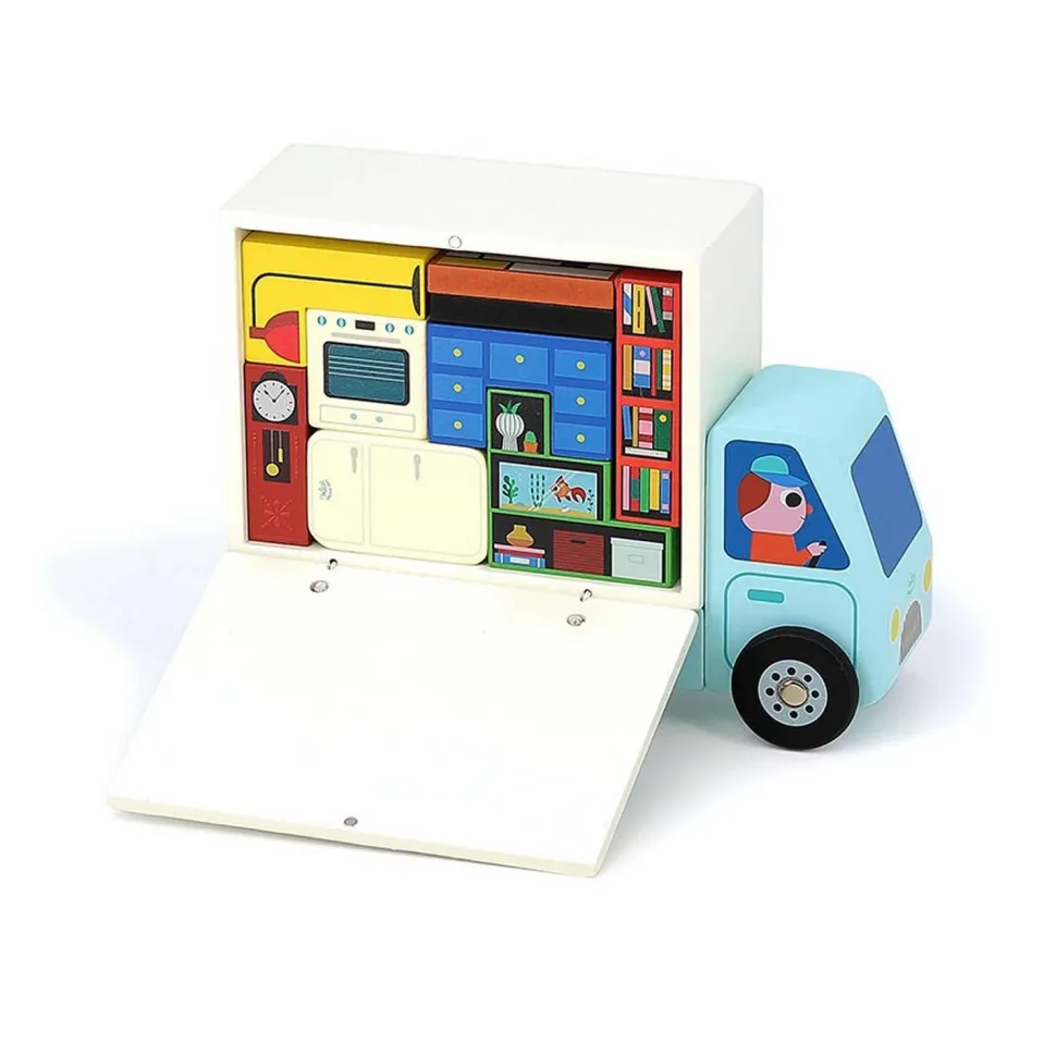 Ce jeu de logique « Pack It Right » en bois de la marque Vilac, illustré par Ingela P.Arrhenius, invite votre enfant dès 5 ans à organiser les meubles d’une maison dans un camion de déménagement. Un concept amusant qui va stimuler sa logique, sa motricité fine, et son sens de l’organisation. Le camion et les meubles peuvent aussi servir pour créer des histoires, favorisant ainsi l’imagination et la créativité. Un jeu éducatif et évolutif pour s’amuser en famille.