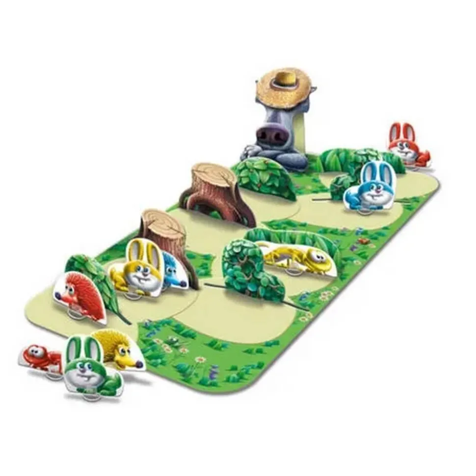 Les animaux de la forêt ont joué dehors toute la journée, et le soir venu, un loup s’est assoupi sur le chemin. Placez aléatoirement les morceaux de chemin sur le plateau et vous pouvez commencer. Chacun son tour, les joueurs lancent le dé, choisissent un des 3 animaux de leur couleur et les fait avancer du nombre de cases affichées sur le dé. Le plateau est composé de souches et buissons derrière lesquelles le joueur peut se cacher s’il le souhaite. Mais attention : si le dé affiche le loup, il se réveille et effraie tous les animaux sur le plateau qui ne sont pas cachés convenablement derrière des objets qui doivent alors retourner au début et recommencer…