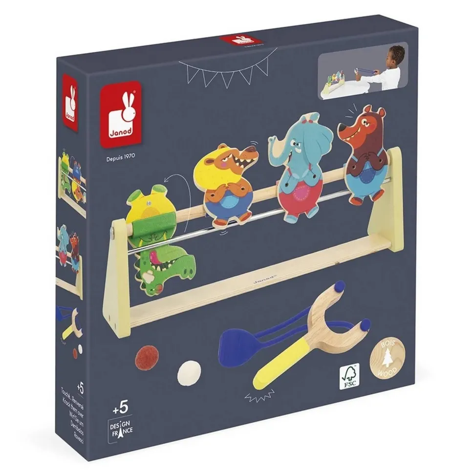 Si vous êtes lassés des jeux de tir ou de lancer classiques, optez pour cette option beaucoup plus originale dont le principe est simple : munis de leur lanceur et d’une balle en feutrine, les enfants visent les animaux et tirent pour tenter de les renverser. Crocodile, lion, éléphant et ours ont plutôt l’air confiant : ils ne savent pas ce qui les attend ! Une fois la tête à l’envers, on fait moins les fiers ! Voilà un jeu type kermesse parfait pour développer la concentration, l’adresse, mais aussi la coordination. À vous d’adapter la distance entre le lanceur et les cibles pour différents niveaux de difficulté. Le lanceur en forme de lance-pierre et les animaux dingos qui composent ce jeu invitent au challenge ! Les personnages tiennent debout grâce à un système d’aimants et mesurent 11 cm de haut.