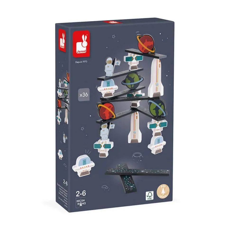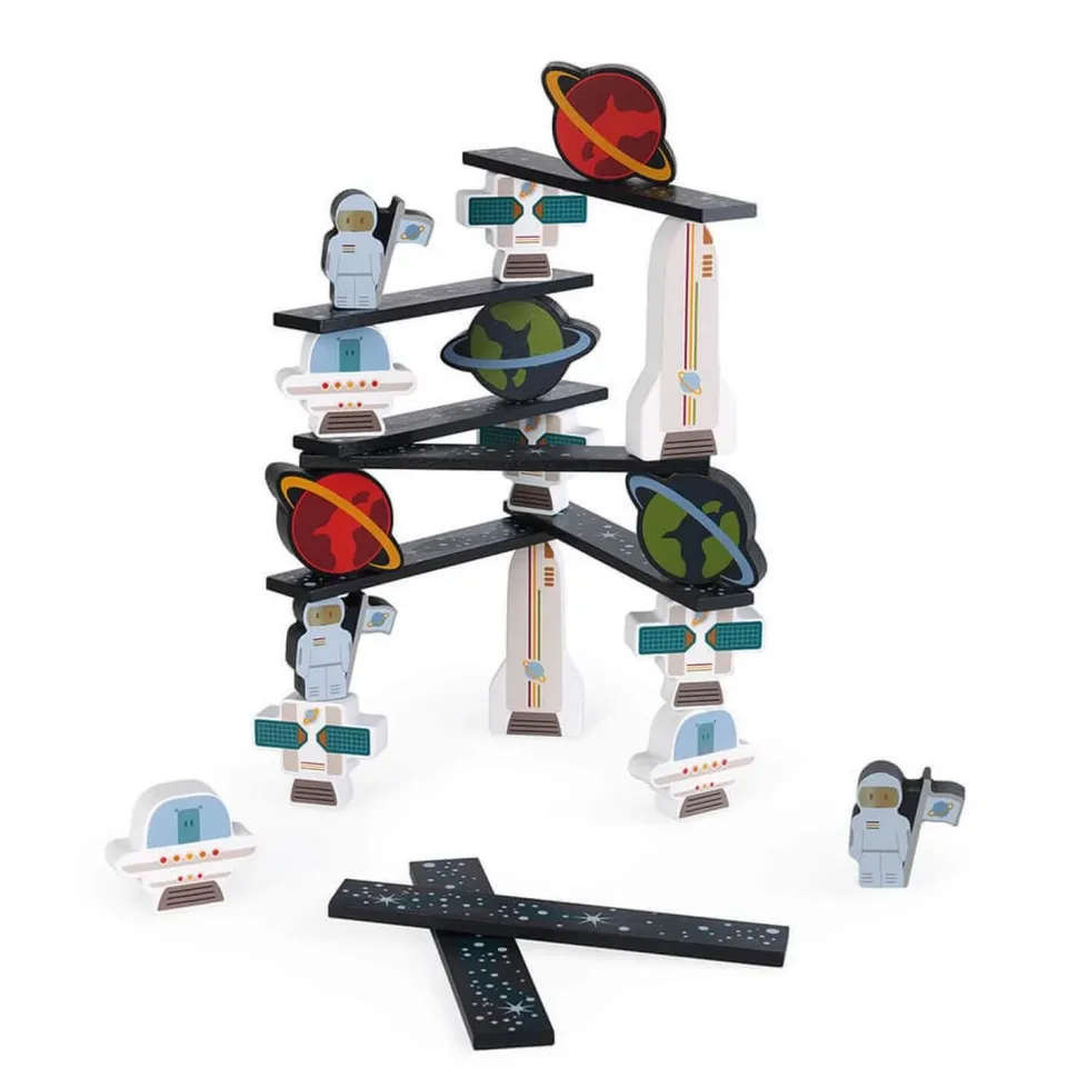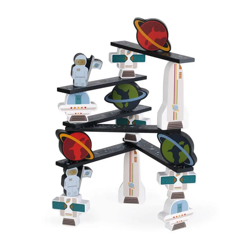 Cosmonautes, satellites et fusées doivent aller ensemble le plus haut possible dans l’espace en trouvant l’équilibre parfait. Ce beau jeu d’adresse en bois est idéal pour les enfants à partir de 2 ans qui vont devoir faire preuve d’adresse et de réflexion afin de choisir la pièce qui permettra d’atteindre les étoiles sans tout faire tomber !