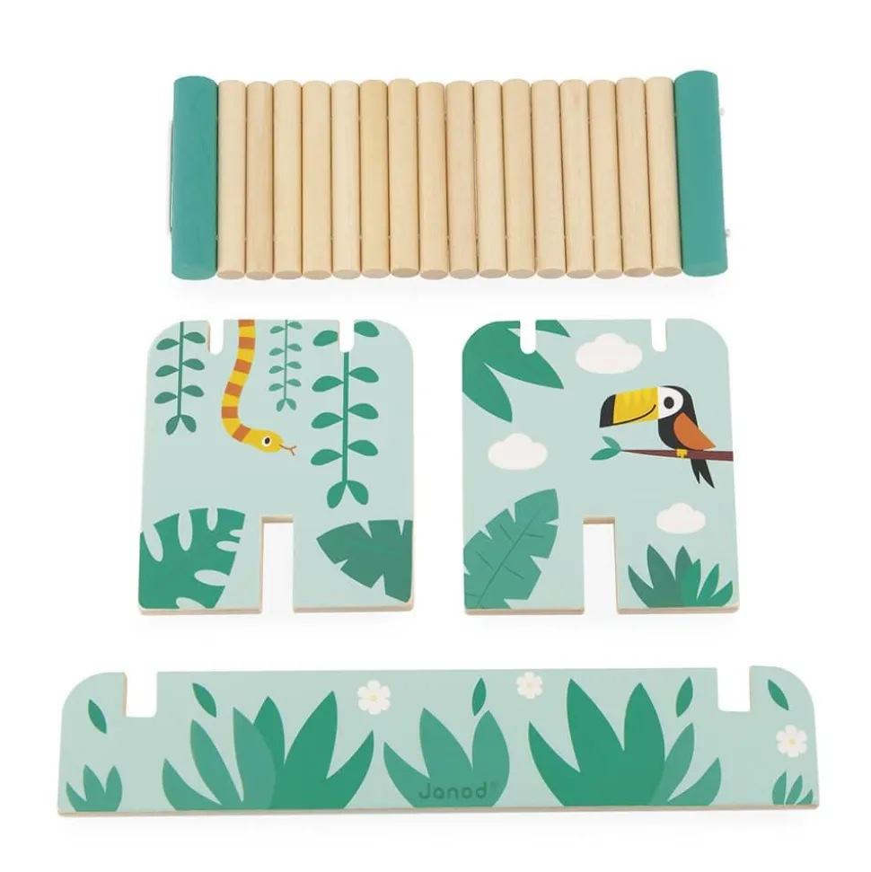 Y aura-t-il de la place pour tout le monde sur le pont suspendu ? Ce pont de singe en bois au cœur de la forêt tropicale est prêt à accueillir une foule d’animaux qui souhaitent le traverser. Grenouilles, lémuriens et perroquets, mais aussi des feuilles et des ananas vont devoir trouver l’équilibre dans ce jeu d’adresse haut en couleurs.