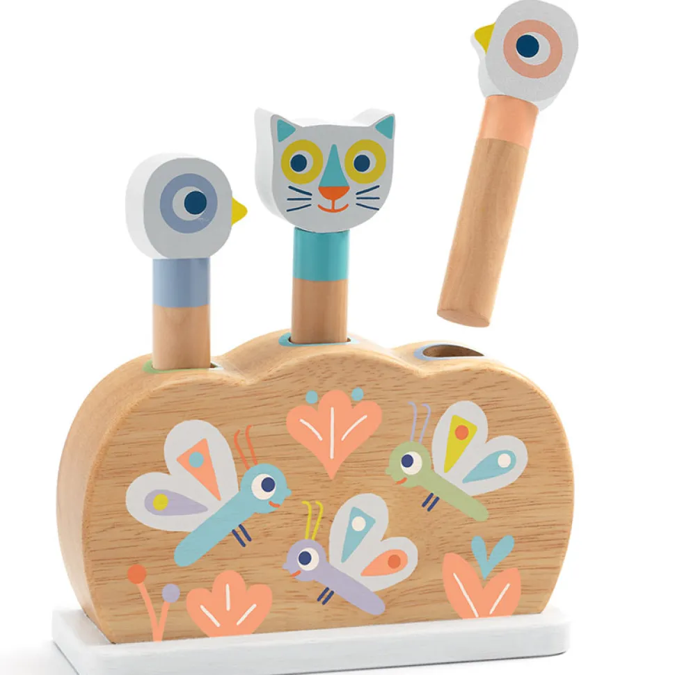 Découvrez ce joli jeu en bois de la marque Djeco, « BabyPopi » pour les enfants dès 1 an.Contenu :- 1 socle – 1 tube avec une tête de chat- 2 tubes avec des têtes d’oiseauxSon socle en bois est en forme de nuage, il est joliment décoré avec des papillons et des fleurs dans des tons pastels. L’enfant s’amuse à encastrer les tubes dans les trous du dessus. Les tubes en bois sont surplombés des têtes des animaux. Ce qui permet à votre petite fille ou à votre petit garçon de les attraper facilement et les tenir fermement pour réussir à les insérer dans les trous.Un jeu d’éveil et de manipulation qui développe l’habilité des jeunes enfants et leur fait acquérir le sens de l’observation, le tout en s’amusant !Dimensions du socle : 14,5 x 15,5 x 5 cm