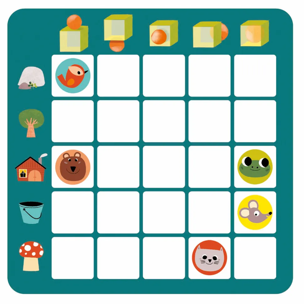 Avec le jeu Topologix de la marque Djeco, apprenez à reconnaître et à situer les objets !Contenu :- un plateau (une grille) en bois- 5 petits pions ronds- 20 cartes représentant un dessin.Le but du jeu est simple. Il y a une grille en bois de 5 lignes et de 5 colonnes à remplir avec les cinq pions à l’aide d’une carte qui représente un dessin. Le but est de reconnaître l’objet et l’animal et de situer ce dernier.Les pions représentent cinq animaux différents : une souris, un ours, un chat, un oiseau et une grenouille qu’il faut placer dans la grille selon la ligne et la colonne. Est-il à proximité d’un caillou, d’un arbre, de la maison, d’un seau ou d’un champignon ? Attention, ces objets peuvent ne pas être de la forme et de la couleur exactes du dessin. Une fois que l’enfant aura répondu à cette question, il devra situer l’animal à partir de cet objet. Par exemple, si la souris est à proximité du seau, l’enfant doit se poser la question suivante : la souris est-elle au-dessus, en-dessous, devant, derrière ou à l’intérieur du seau ?Avec cet exercice, l’enfant apprendra à situer un animal, à comprendre les différents termes pour le situer mais il apprendra aussi à reconnaître des objets ainsi que des couleurs et des formes.Dimensions du produit : 21.5 x 21.5 x 3 cm.