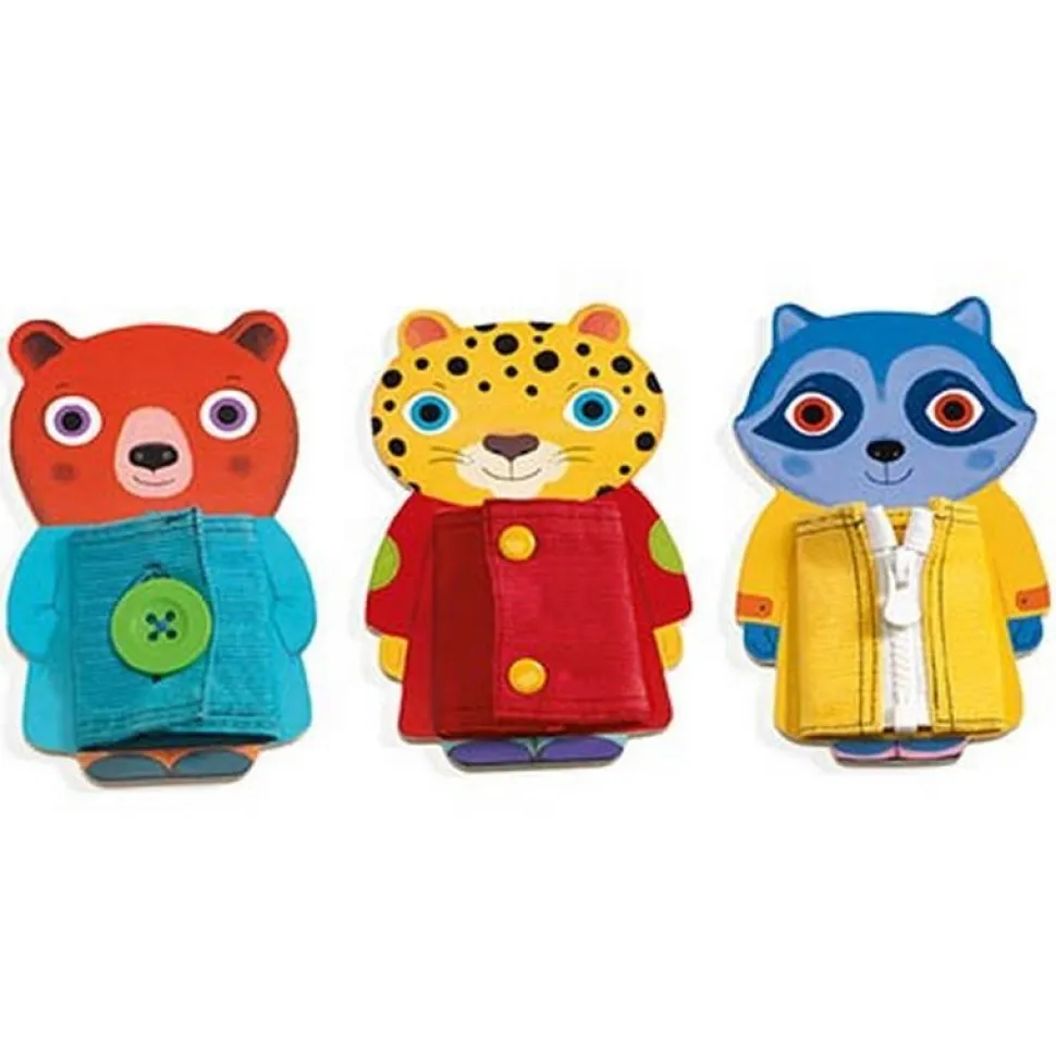 Voici un superbe jeu éducatif pour les enfants lors de l’éveil. Ce jeu est composé de 3 personnages en bois tous vêtus d’un manteau différent. Nous retrouvons un ourson aux yeux écarquillés, un léopard et un raton laveur.