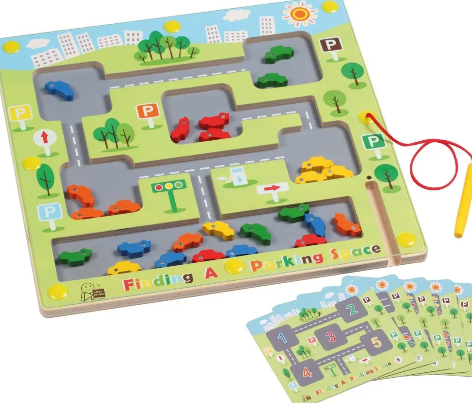 25 voitures colorées… à conduire avec adresse à travers les ruelles étroites pour rejoindre leur parking de la même couleur. Parfois, d’autres voitures doivent manœuvrer pour ouvrir la voie. Cinq cartes à motifs recto verso présentent diverses possibilités de stationnement pour la reconnaissance et l’attribution des couleurs. Ce jeu de stylo magnétique encourage la logique, l’adresse et la coordination. Matériau : bois, contreplaqué, acrylique. Dimensions : 35,5 x 33 x 1,5 cm. Âge : 3 ans.