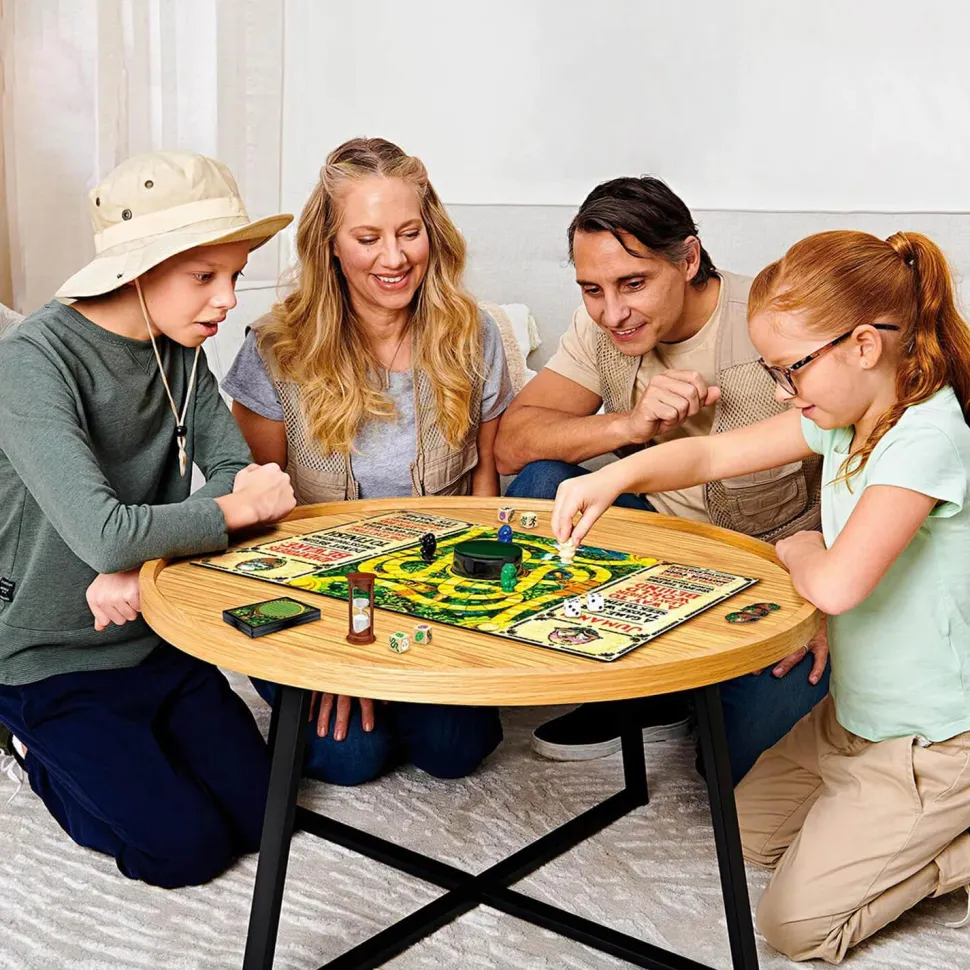 Traquer des lions, charger des rhinocéros, attraper des crocodiles et d’autres créatures dangereuses – dans le monde sauvage de Jumanji, ils ne sont qu’à un jet de dé ! Prenez votre pion, lancez le dé à huit faces et avancez dans la jungle. Piochez une carte de danger, puis utilisez votre décodeur pour découvrir le message secret et voir si une catastrophe survient. Vos coéquipiers doivent courir contre la montre pour vous sauver. La jungle menace et commence à remplir la grille. Si la grille se remplit, la jungle vous dominera, vous et vos coéquipiers, tout le monde est perdant. Si vous êtes le premier à atteindre le centre avant que la grille ne se remplisse, criez « Jumanji! » et gagnez !