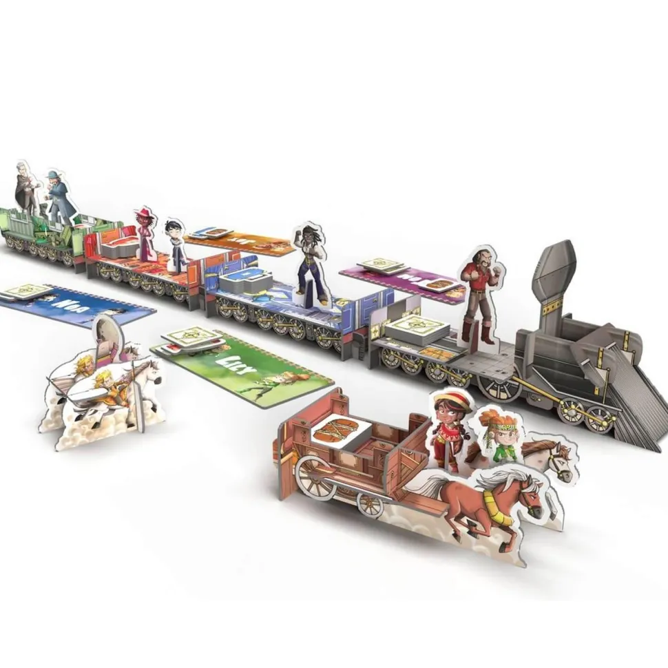 La partie s’arrête immédiatement dès qu’une pile de Bagages du train est VIDE. Formez alors deux piles, une composée des bagages récupérés par tous les enfants et l’autre avec ceux des Bandits. La pile avec le plus de Bagages l’emporte et donne la victoire à l’équipe qui l’a constituée.