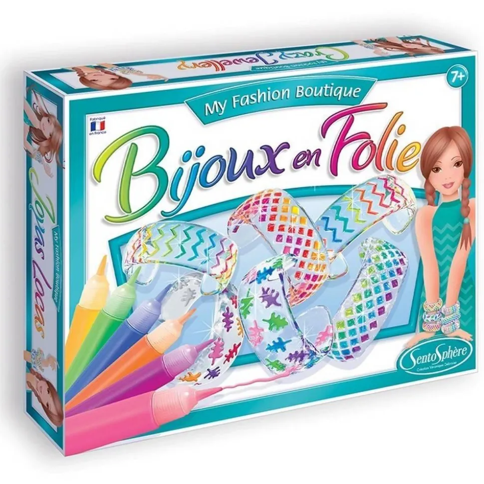 Kit créatif bijoux en folie de SentosphèreQuel plaisir de pouvoir peindre trois bracelets pour les assortir à toutes ses tenues !Ce coffret propose 3 bracelets transparents comme du cristal dont on peut peindre et repeindre les motifs avec une gamme de 10 couleurs chatoyantes.Contenu du coffret : – 3 bracelets en plexiglas de 5,2 cm de diamètre intérieur.- 10 tubes de peinture vitrail.- 1 mode d’emploi avec de nombreux exemples de mise en couleur.