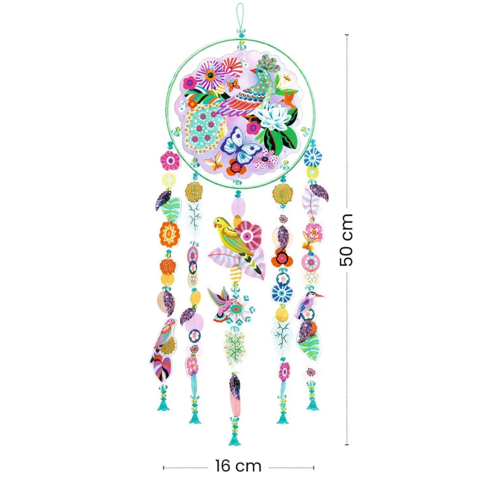 Contenu : +80 formes décoratives, 1 anneau en métal enrubanné (diam. 16 cm), 1 assortiment de perles facettées et sequins, 4 m de fil transparent, 1 planche de pastilles autocollantes transparentes, 1 feuillet de pas-à-pas détaillé.