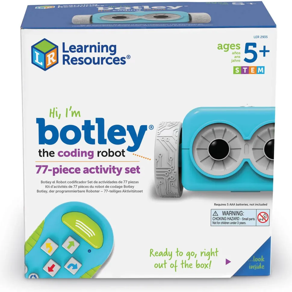 Ce kit ludique et intéressant comprend 77 pièces : un robot Botley, un module de programmation à distance, des bras de robot amovibles, 40 cartes de codage, six panneaux, huit bâtons, 12 cubes, 2 cônes, 2 drapeaux, 2 balles, un but et une feuille d’autocollants. Guide d’activités multilingue complet inclus.