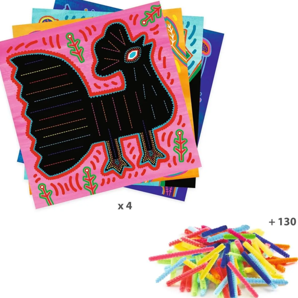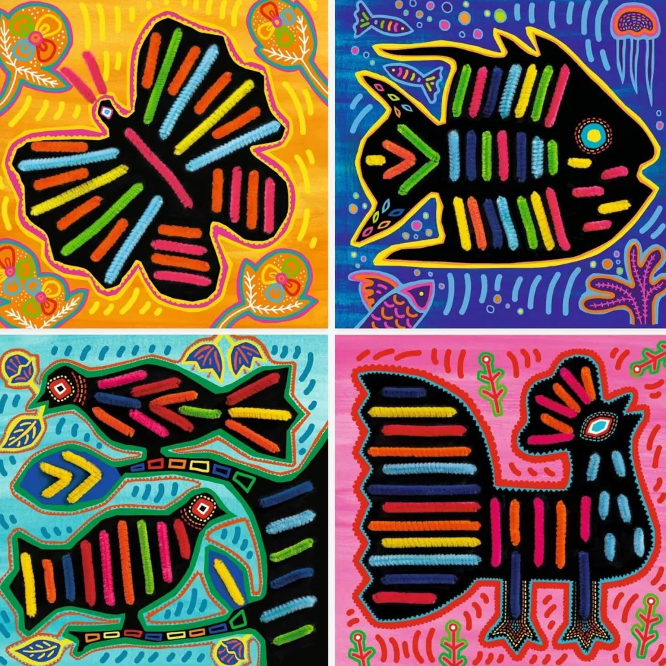 Une activité manuelle d’enfilage avec de nombreux fils chenille. En suivant les indications du livret explicatif, l’enfant passe les fils chenille dans les gros trous des cartes. Une fois la carte remplie, elle devient un magnifique tableau coloré inspiré de l’art Kuna d’Amérique du Sud ! Cette activité originale et très simple permet à l’enfant de réaliser 4 jolis tableaux avec du fil chenille.