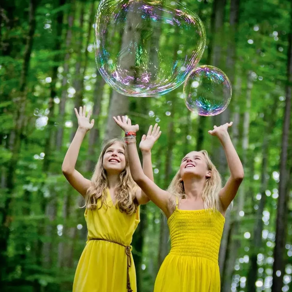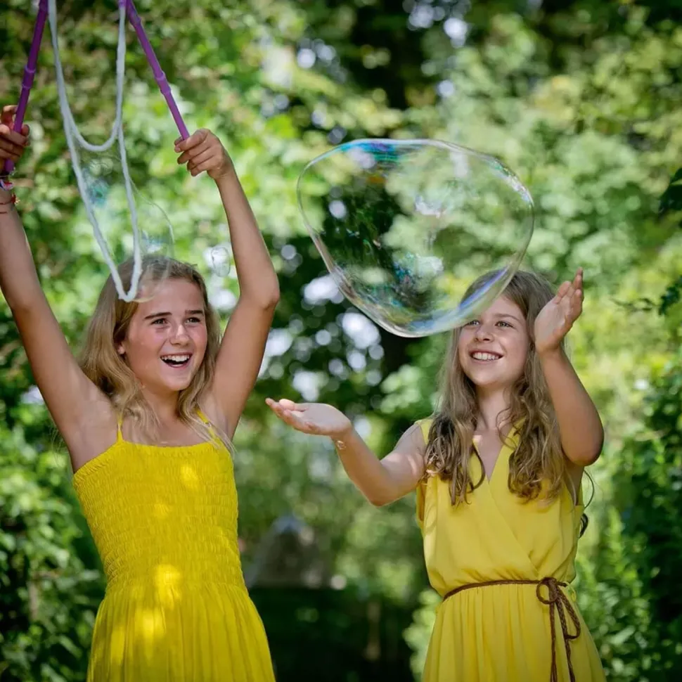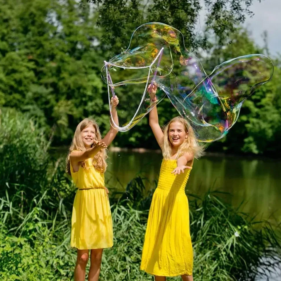 Utilisez le savon et les bâtons avec la corde, pour créer des bulles toujours plus grosses !