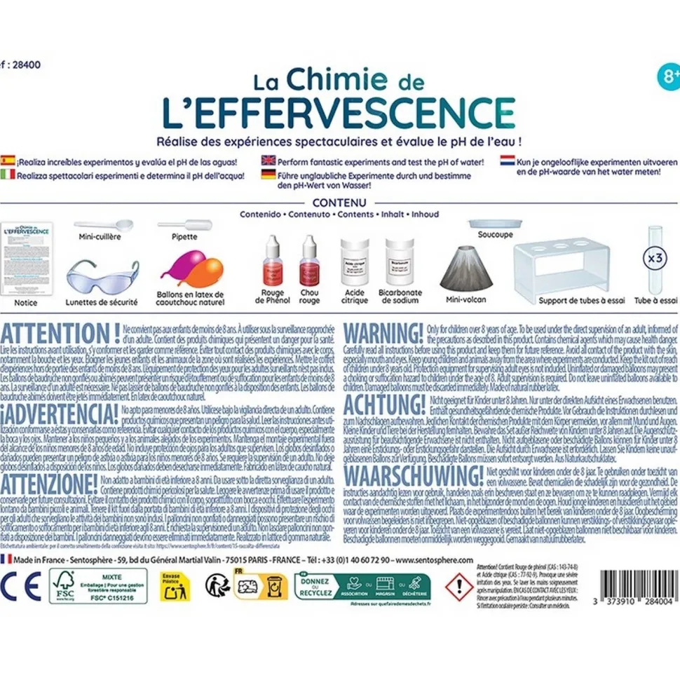 La Chimie de l’Effervescence vous propose de découvrir l’univers mystérieux de la chimie grâce à des expériences aussi spectaculaires qu’amusantes : créer une réaction d’effervescence dans un tube à essai et dans un petit volcan, mesurer le pH de l’eau ou encore observer des changements de couleur dans une substance liquide… en toute sécurité bien sûr !