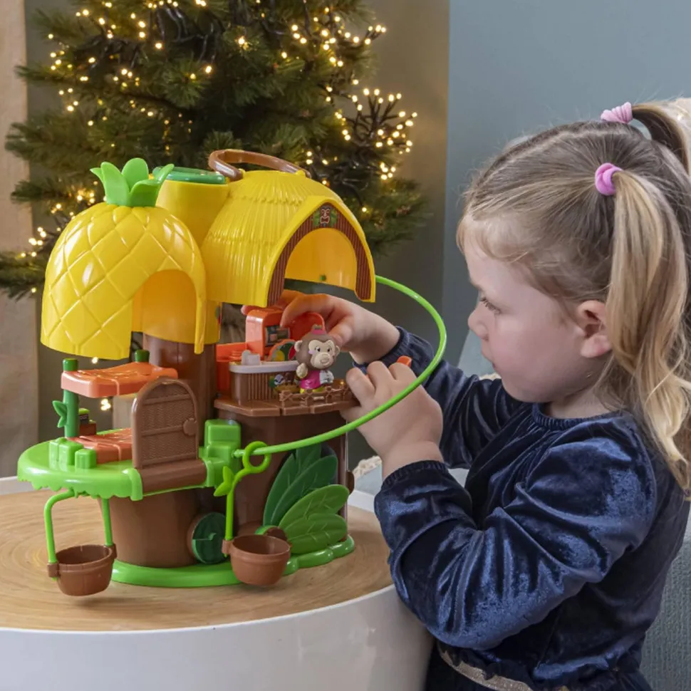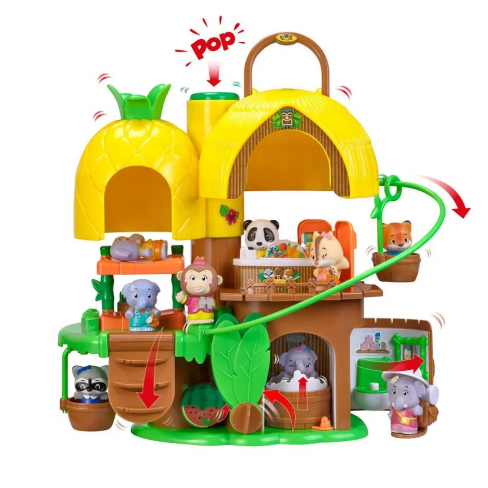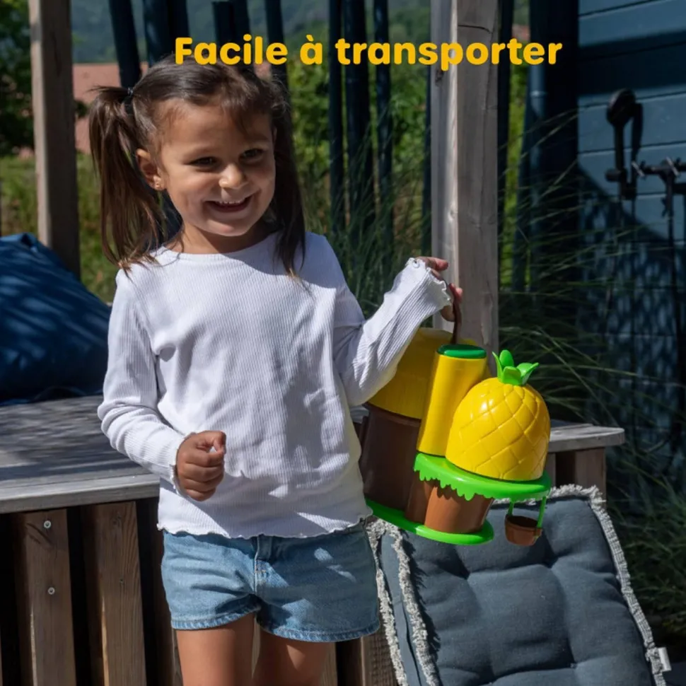 En appuyant sur un bouton, POP ! : l’ananas et la hutte se soulèvent pour révéler l’intérieur.