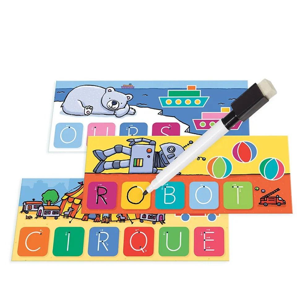 Apprendre en s’amusant c’est possible avec ce coffret la petite école : j’écris les mots – le jeu d’écriture destiné aux enfants à partir de 4 ans !Contenu :- 30 fiches effaçables- 1 feutre effaçable- 1 guide de jeuLes premiers pas vers l’écritureCe jeu est idéal pour apprendre à écrire des mots, les effacer et recommencer ! En compagnie d’images colorées aux illustrations amusantes, votre enfant pourra écrire et dessiner en repassant sur le modèle. Chaque fiche comporte une image colorée et amusante correspondant au mot qu’il faut reproduire : un coffret aux trésors sur une plage pour le mot bijoux, un singe sur sa liane pour le mot singe, un pirate à l’abordage pour le mot pirate … Les points indiquent où commencer et les petites flèches vous montrent dans quel sens écrire la lettre.Un jeu très complet et inventif !