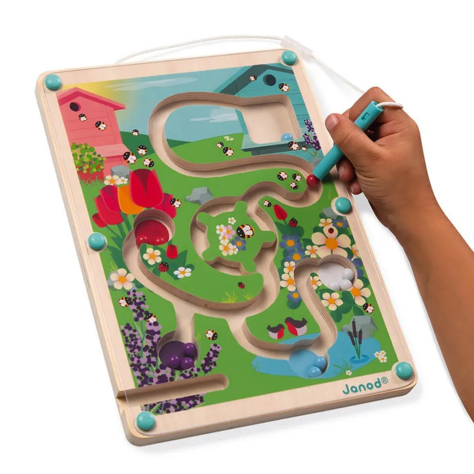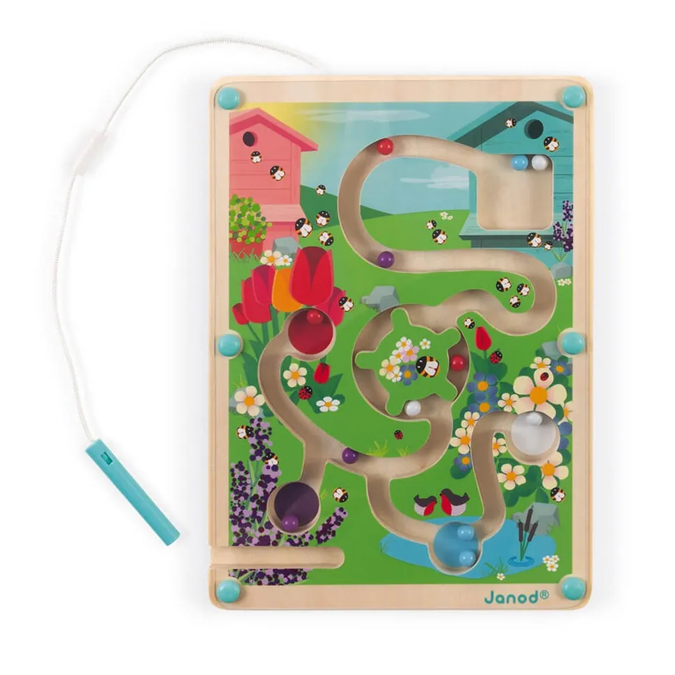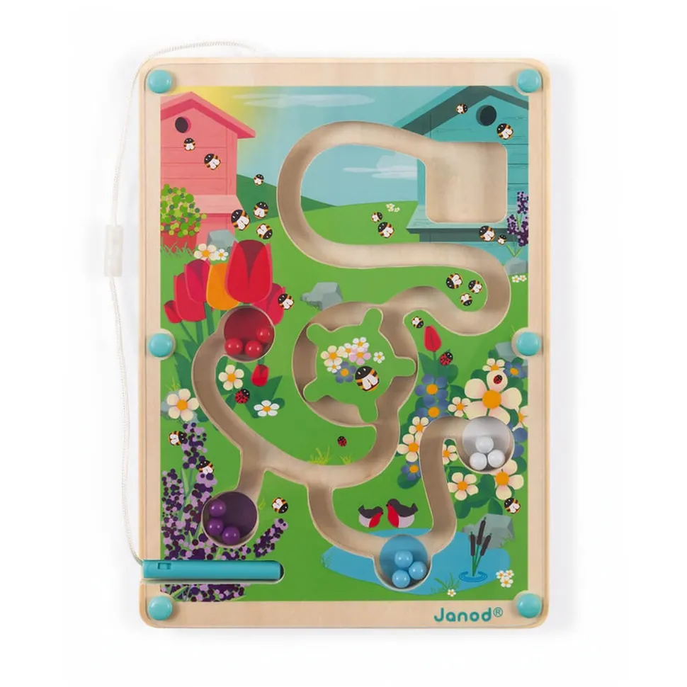 Depuis la ruche, il faudra traverser le labyrinthe et apporter les 12 billes colorées dans la zone correspondante à l’aide du stylet magnétique ! Les billes bleues devront se retrouver à la mare, les rouges au milieu des tulipes etc… Mais attention à bien prendre le tourniquet pour ne pas être bloqué !
