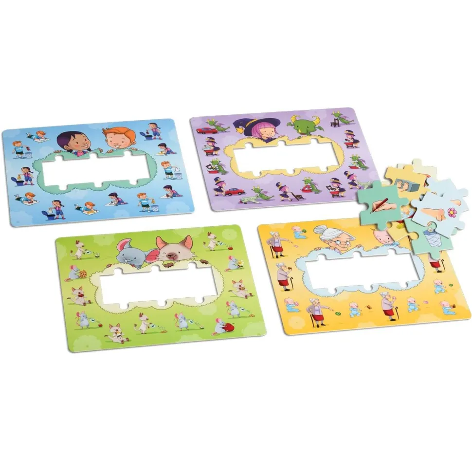 Pour les enfants, le but du jeu est d’assembler des morceaux de casse-tête pour apprendre à faire des phrases complètes comprenant un sujet, un verbe et un complément. Les joueurs choisissent une des quatre planches de jeu et prennent les morceaux de casse-tête associés. L’enfant choisit un morceau « Sujet », un morceau « Verbe » et un morceau « Complément » pour compléter le casse-tête et former sa phrase. Il tente ensuite de dire la phrase complète, puis il cherche l’illustration correspondant à la phrase sur la planche de jeu.