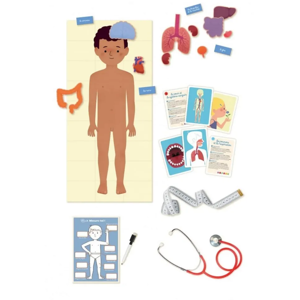 Un coffret d’activités pour accompagner pas à pas l’enfant dans la découverte du corps humain. L’enfant joue à se mesurer avec le mètre mesureur, complète la fiche de santé effaçable et écoute son cœur avec un vrai stéthoscope. Grâce au poster à taille réelle, il place les organes et découvre comment fonctionne son propre corps. Un jeu qui permet aux plus jeunes d’intégrer leur schéma corporel et de répondre aux questions des plus grands sur le fonctionnement du corps humain.