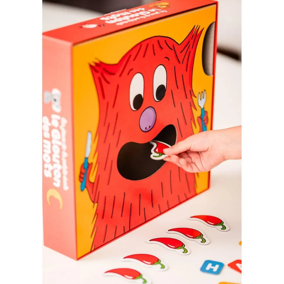 Un jeu coopératif où l’on gagne la partie si le Glouton a mangé ses 6 planches de mots.