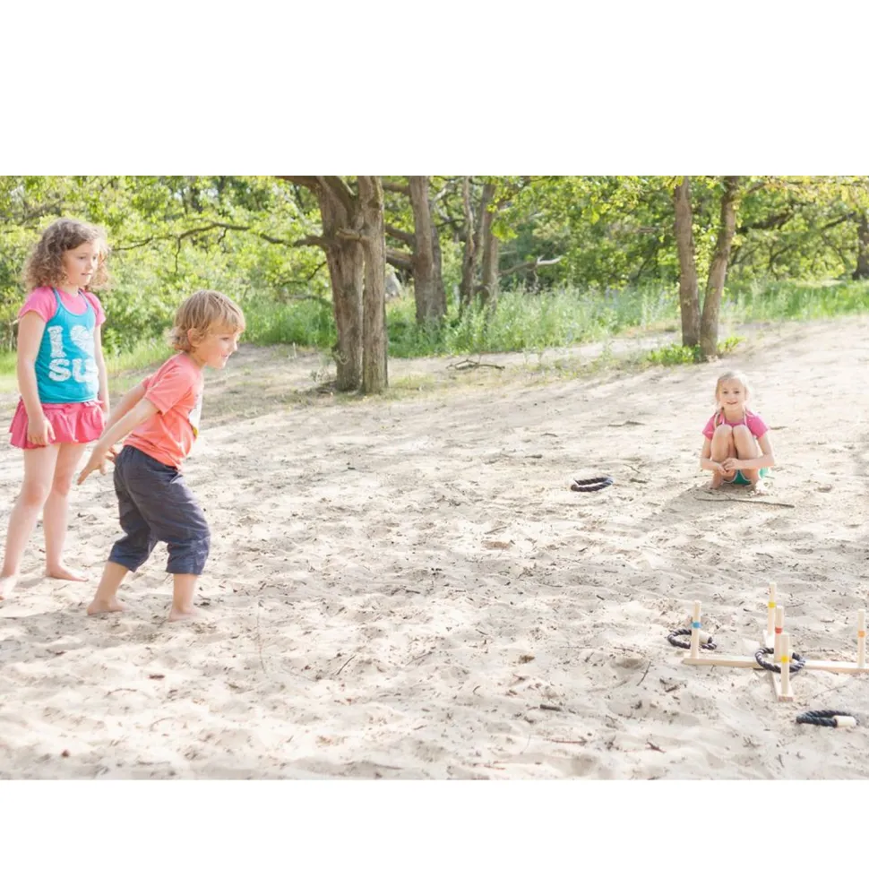 Un jeu d’adresse traditionnel en bois qui plongera les enfants et toute la famille dans une ambiance de kermesse.Très simple, ce jeu se compose d’une structure en bois en forme de croix sur laquelle sont fixés 5 bâtons et 5 anneaux en corde tressée de coloris noir. Le jeu consiste à lancer vos anneaux de sorte qu’ils tombent autour des poteaux en bois. Si vous visez juste vous obtiendrez des points. Chaque bâton étant associé à un nombre de points, le nombre de points remporté varie donc en fonction de la zone du lancer.Faites donc preuve de beaucoup d’adresse pour viser juste et soyez stratégique pour remporter le plus de points.Ce jeu se pratique en extérieur.Dimensions du jeu : 50 cm de largeur x 10 cm de hauteur.Dimensions du coffret de jeu : 51 x 16 x 5 cm.