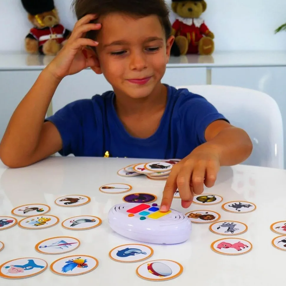 Avec son boîtier qui propose 120 sons que ce soit des bruits d’animaux, des chants d’oiseaux, des instruments de musique ou des sons de la vie quotidienne, vous devrez être attentif pour reconnaître le bon son. Dès qu’un son sort, il faudra dégainer le bon jeton. Le premier qui sort le bon jeton remporte la partie !