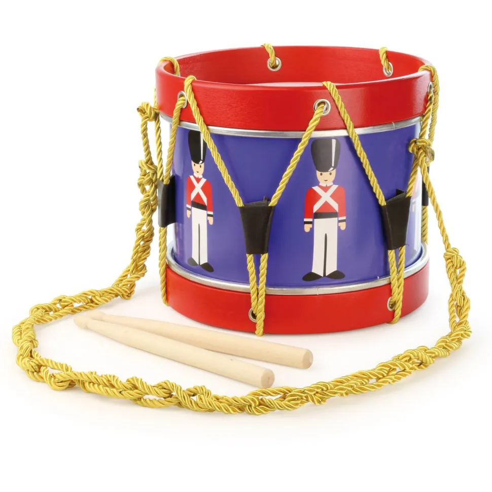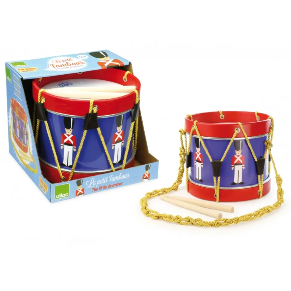 Un joli tambour pour apprendre le sens du rythme et s’entraîner à jouer en fanfare !Contenu :- 1 tambour- deux baguettes en boisCe tambour réalisé en bois de 18 cm de diamètre est joliment illustré avec le contour rouge et un décor sur fond bleu représentant des petits soldats. Tout autour de sa structure, il comporte un cordon tressé doré qui forme une bandoulière et qui permettra à l’enfant de porter facilement ce tambour autour de son cou comme un vrai musicien de fanfare. Votre enfant dès 3 ans, va pouvoir ainsi s’initier aux percussions à l’aide des baguettes en bois, et défiler dans la maison en rythme comme s’il était dans une troupe de musique.Diamètre du tambour : 18 cm.